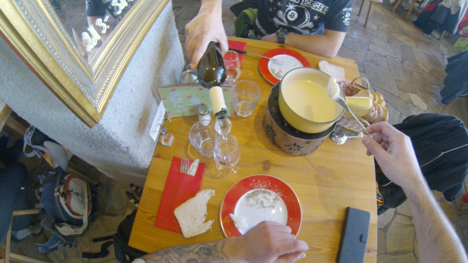 On filme un bon moment le matin en découvrant le domaine que nous visitons pour la première fois. En discutant avec nos colocataires de cabine, on nous conseille un endroit pour manger une bonne fondue… Manque de place dans le restaurant, nous devons nous dépêcher, 30min chrono, une bouteille de blanc, une fondue et on boit le café-abricotine sur la terrasse!