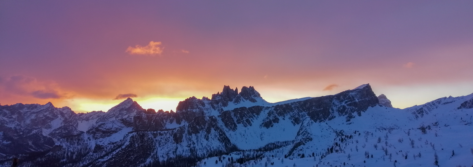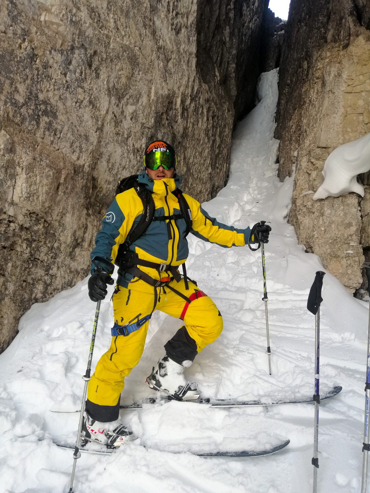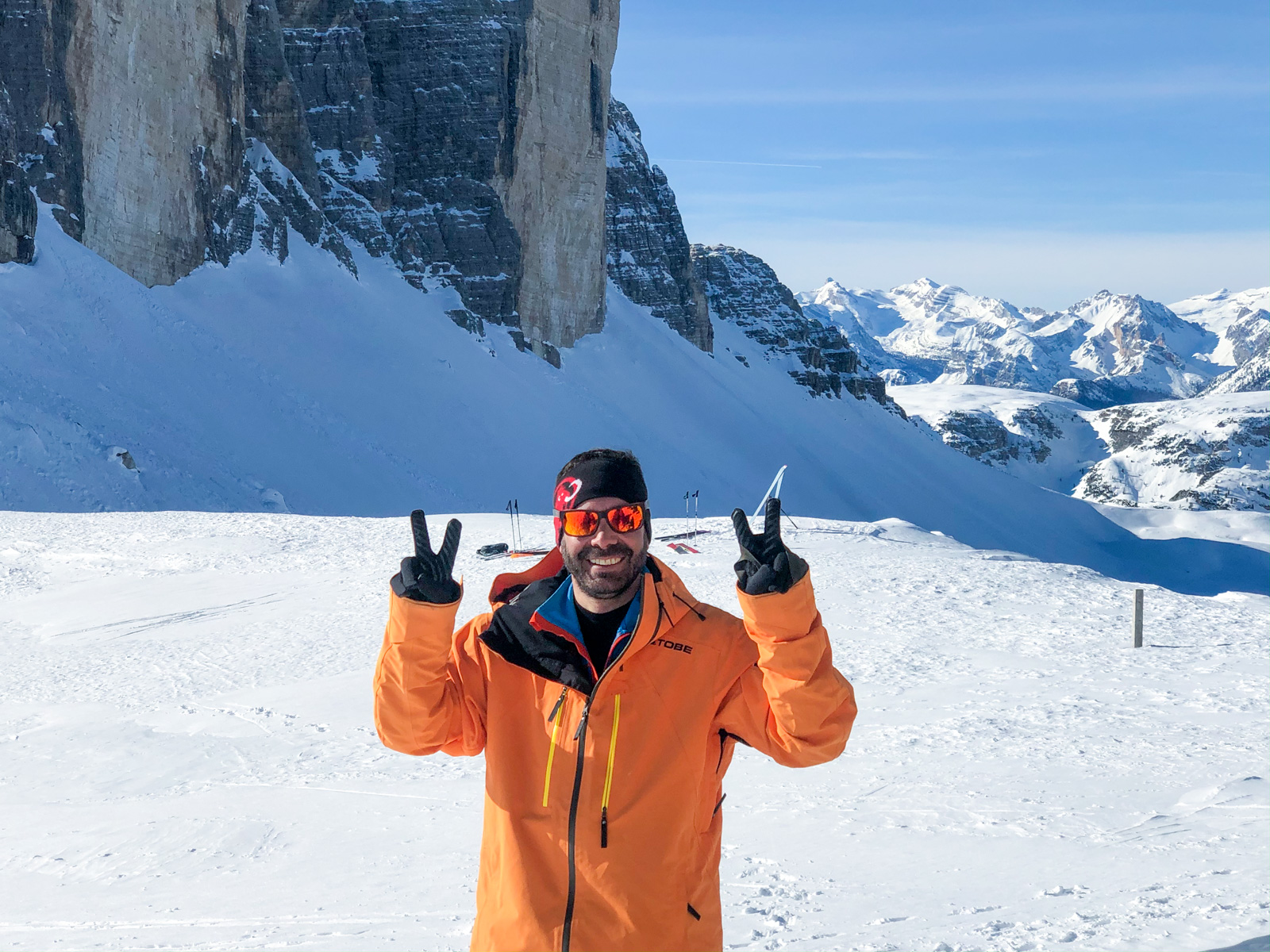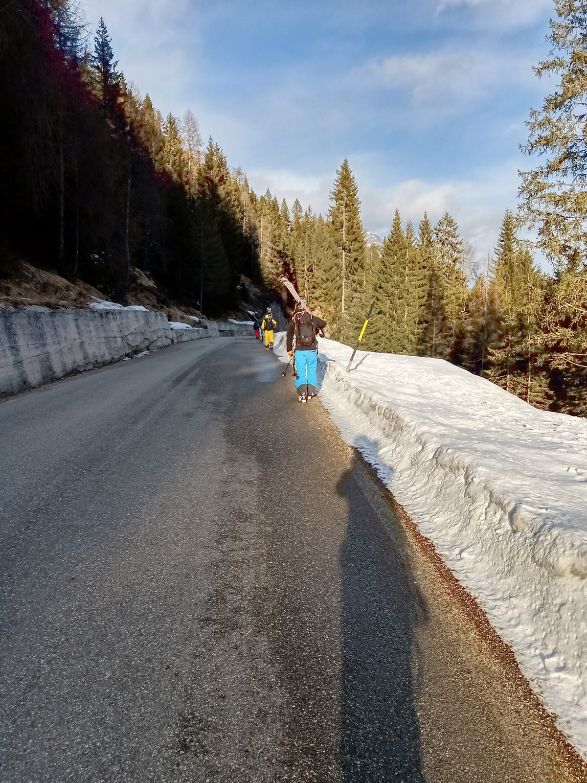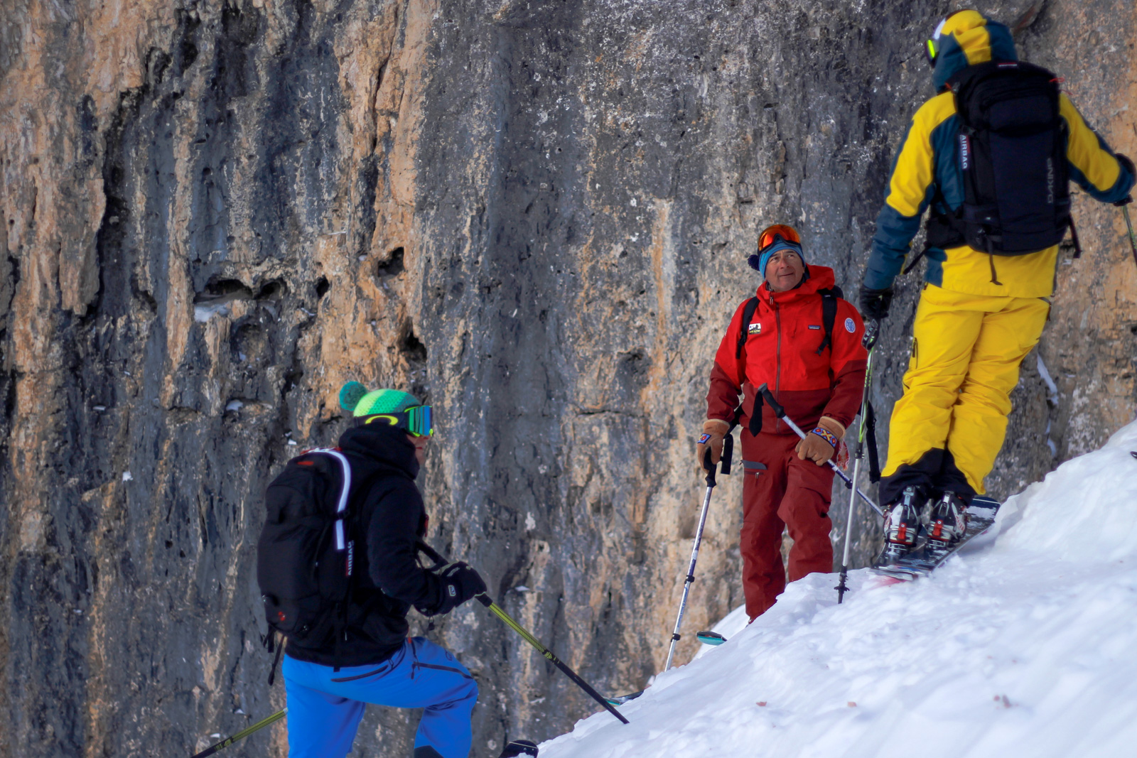 Morgins, 25 janvier 2020, 5h30. Nous chargeons la voiture, il y en a du matériel. Et c’est parti pour un trip routier de 10h, destination Cortina d’Ampezzo dans les Dolomites en Italie. Nous sommes tous les 7 dans la voiture, ça va être long. Après quelques pauses et quelques changements de pilote, nous arrivons dans la station le soir, et rencontrons notre guide Paolo Tassi, lui aussi télémarkeur. La semaine est lancée!