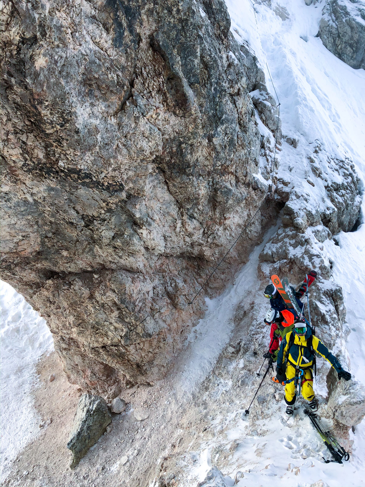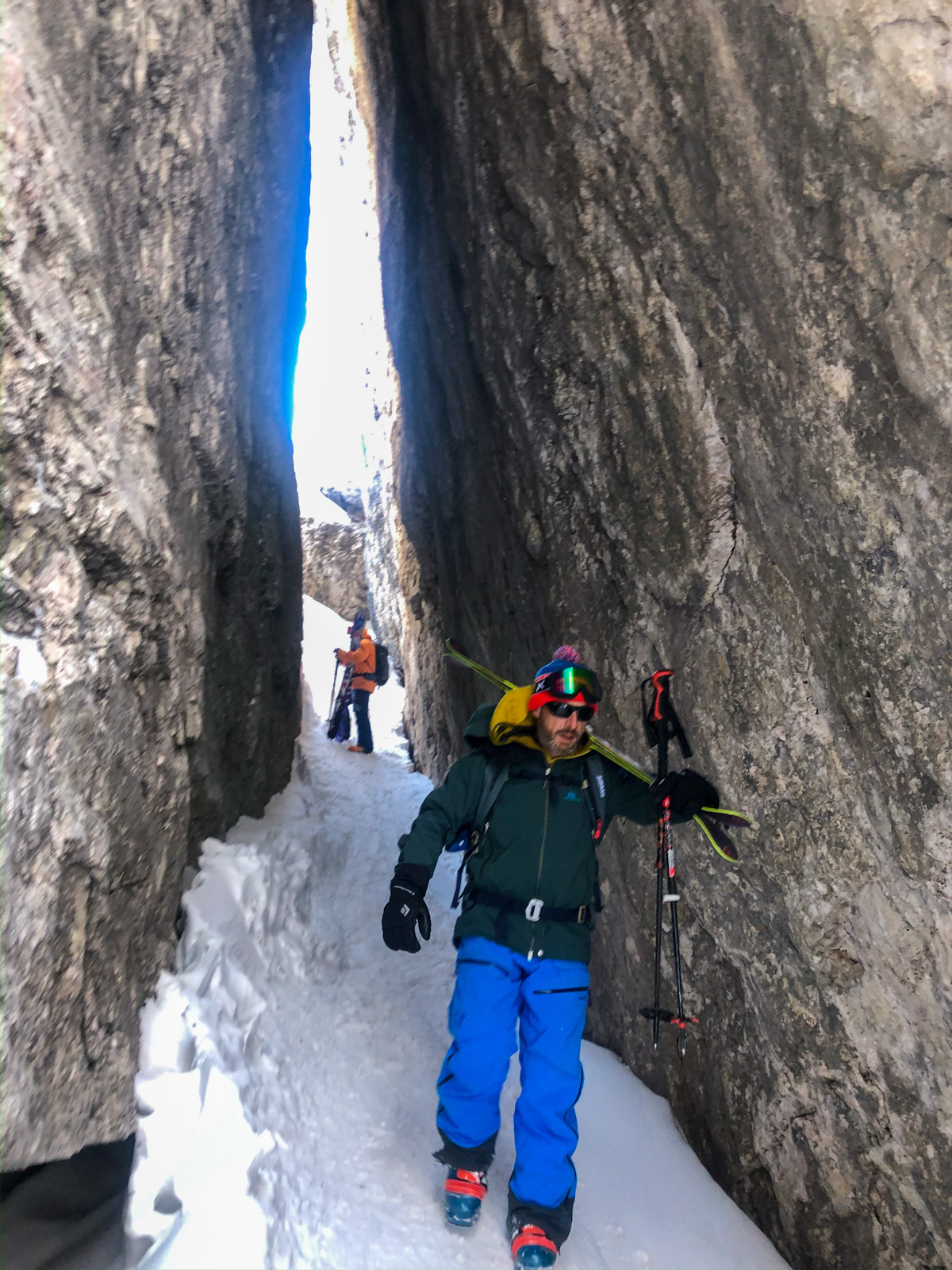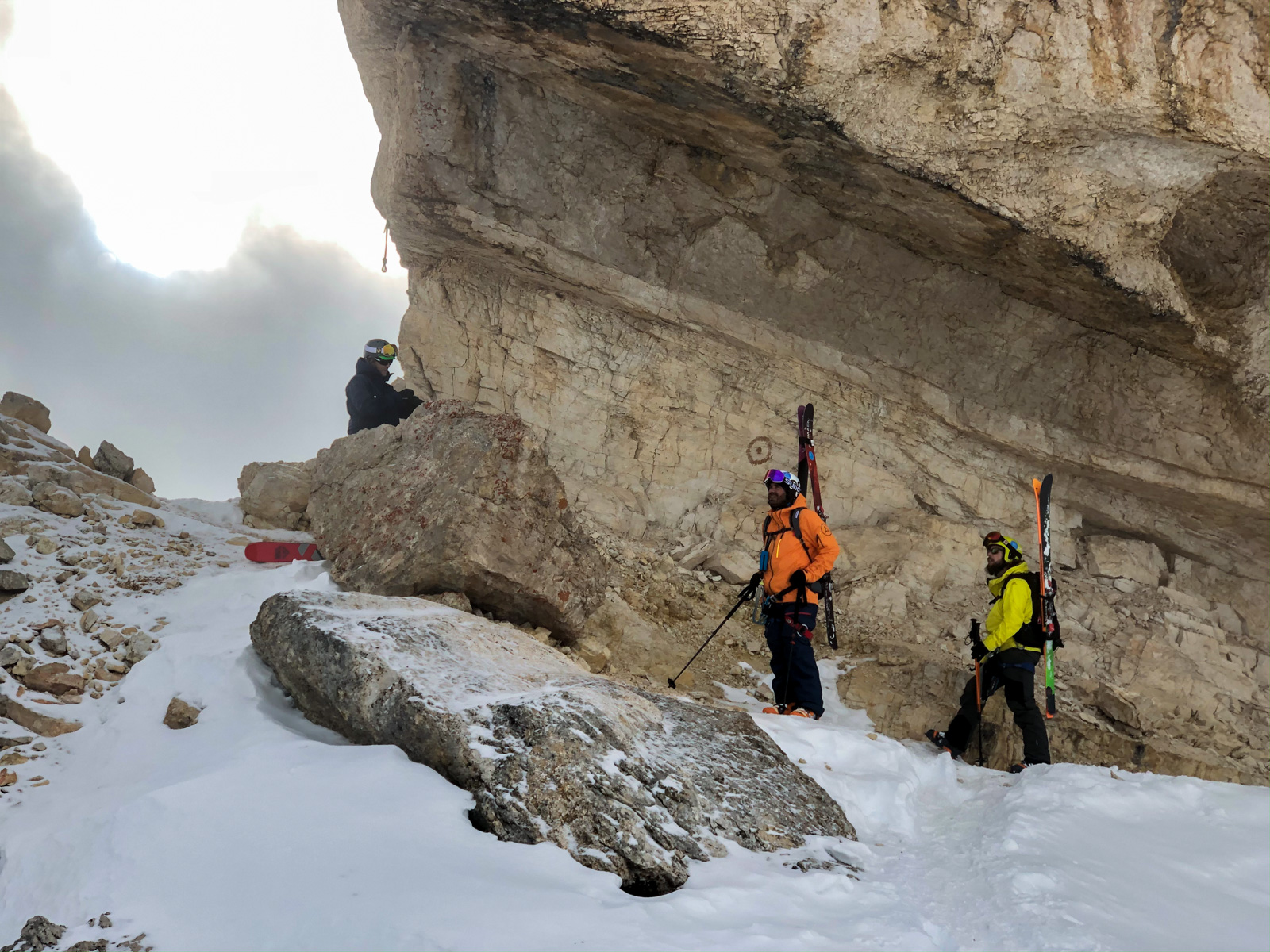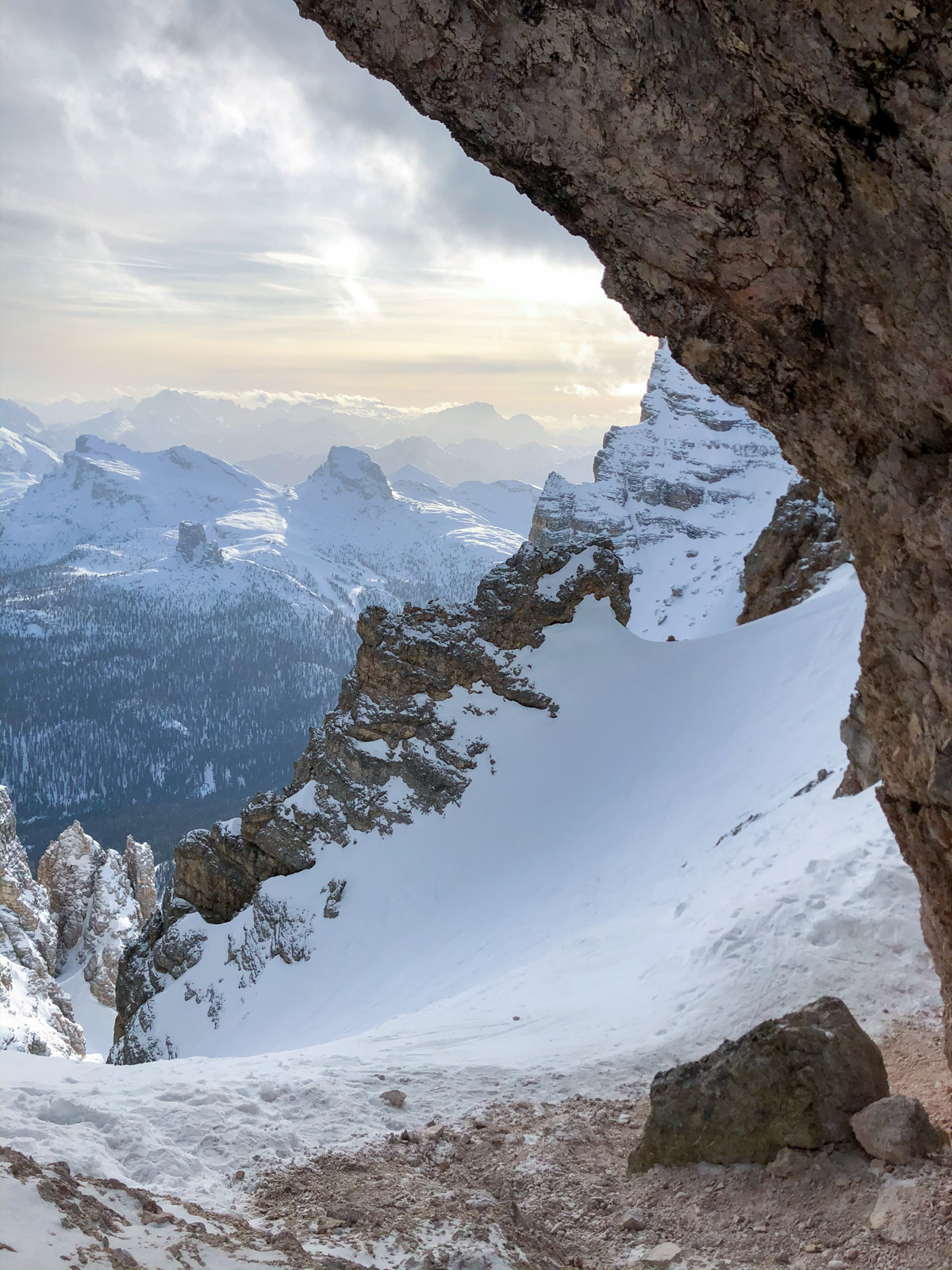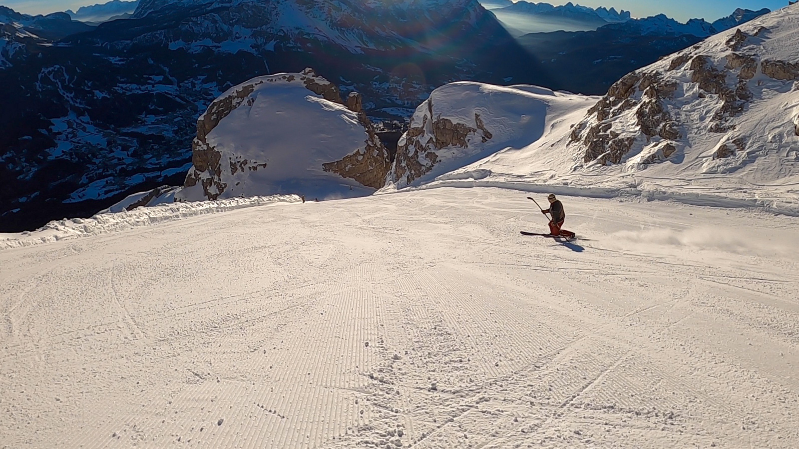 Samedi, dernière journée de ski dans les Dolomites, nous partons à 6h du matin pour admirer le lever du soleil derrière les montagnes. C’est notre «journée pachon». Il fait beau et chaud, une incroyable session, remplie de rires et de gamelles sur la piste. Nous terminons ainsi notre semaine italienne avec un dernier passage par le Bus de Tofana son couloir juste derrière et une halte au refuge d’Angelo Dibona.
