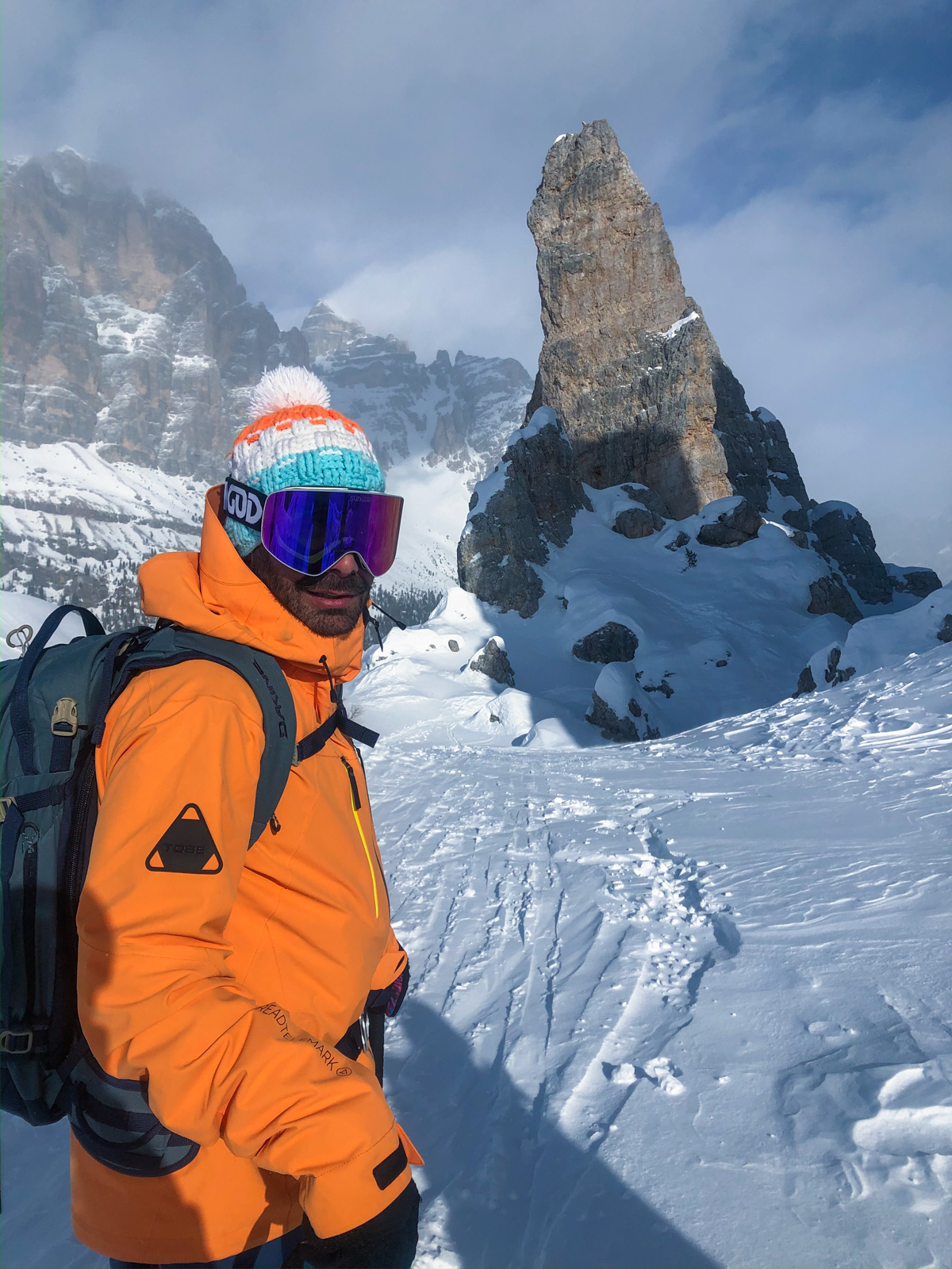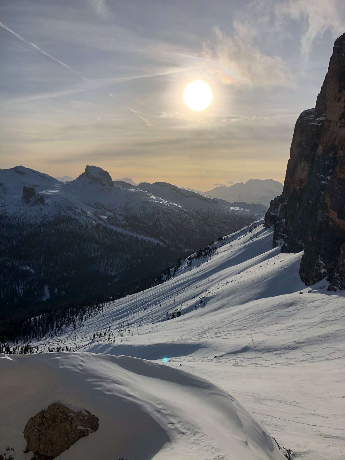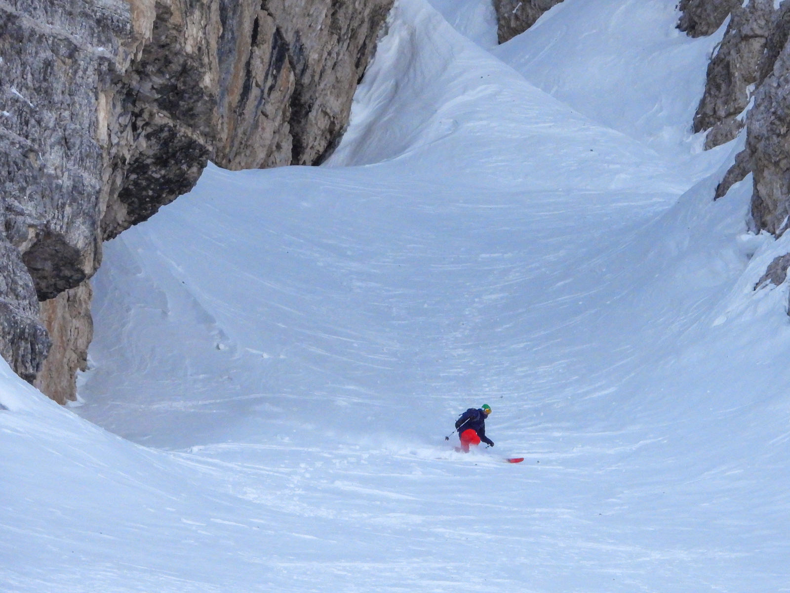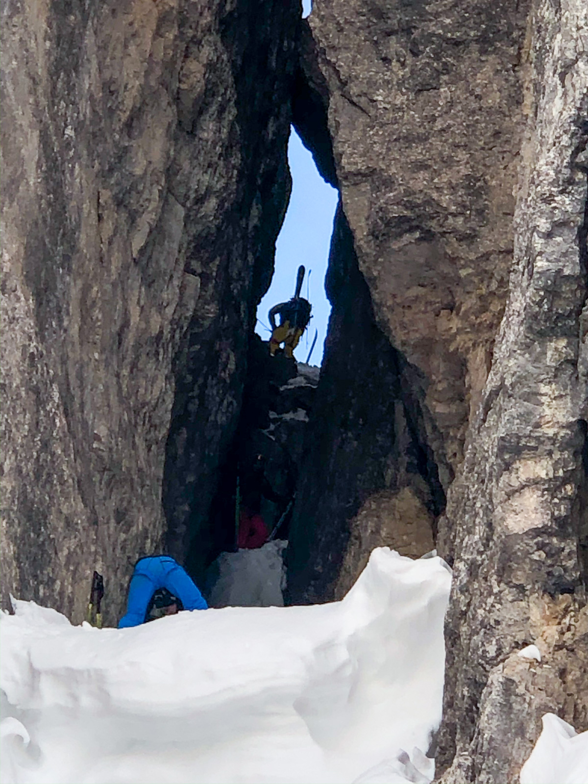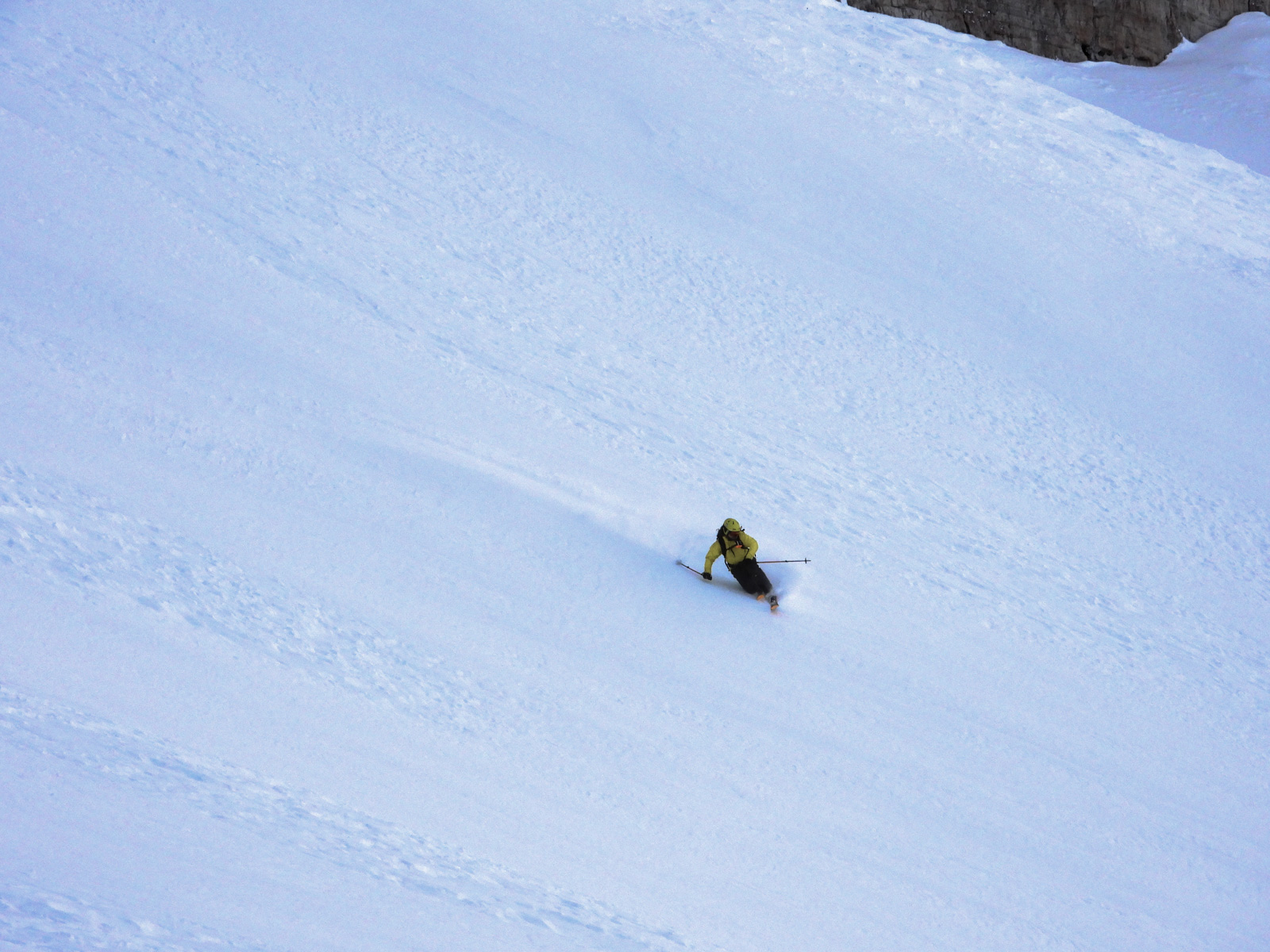 Samedi, dernière journée de ski dans les Dolomites, nous partons à 6h du matin pour admirer le lever du soleil derrière les montagnes. C’est notre «journée pachon». Il fait beau et chaud, une incroyable session, remplie de rires et de gamelles sur la piste. Nous terminons ainsi notre semaine italienne avec un dernier passage par le Bus de Tofana son couloir juste derrière et une halte au refuge d’Angelo Dibona.