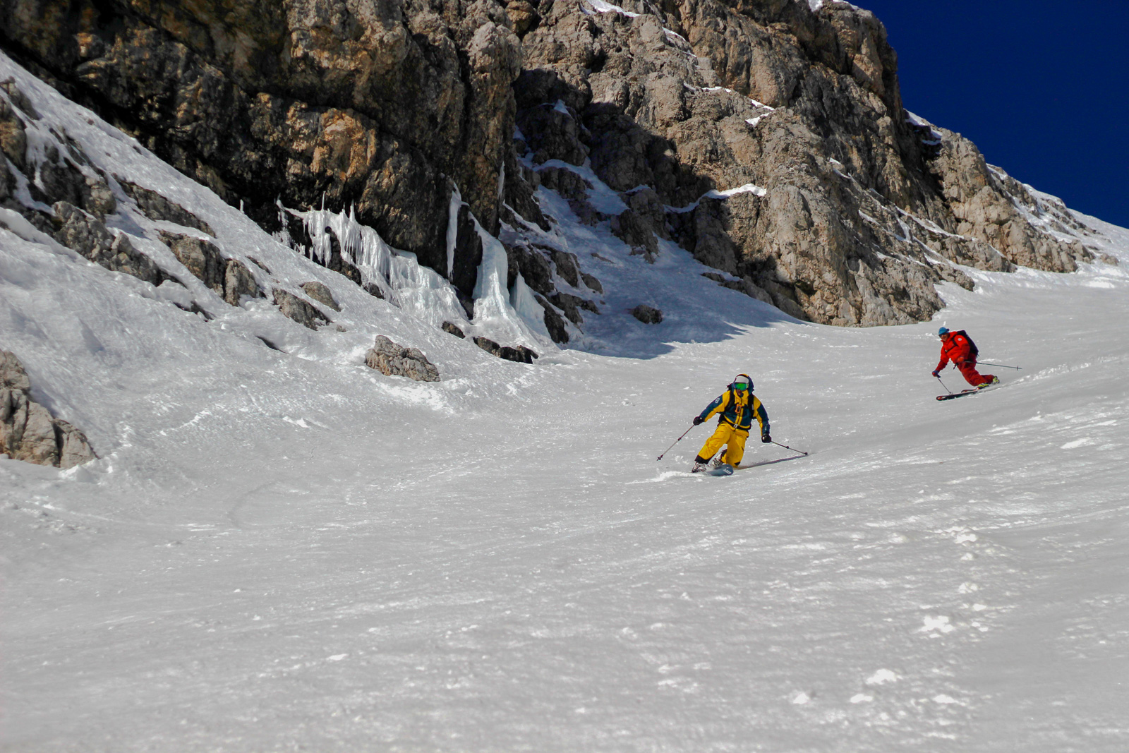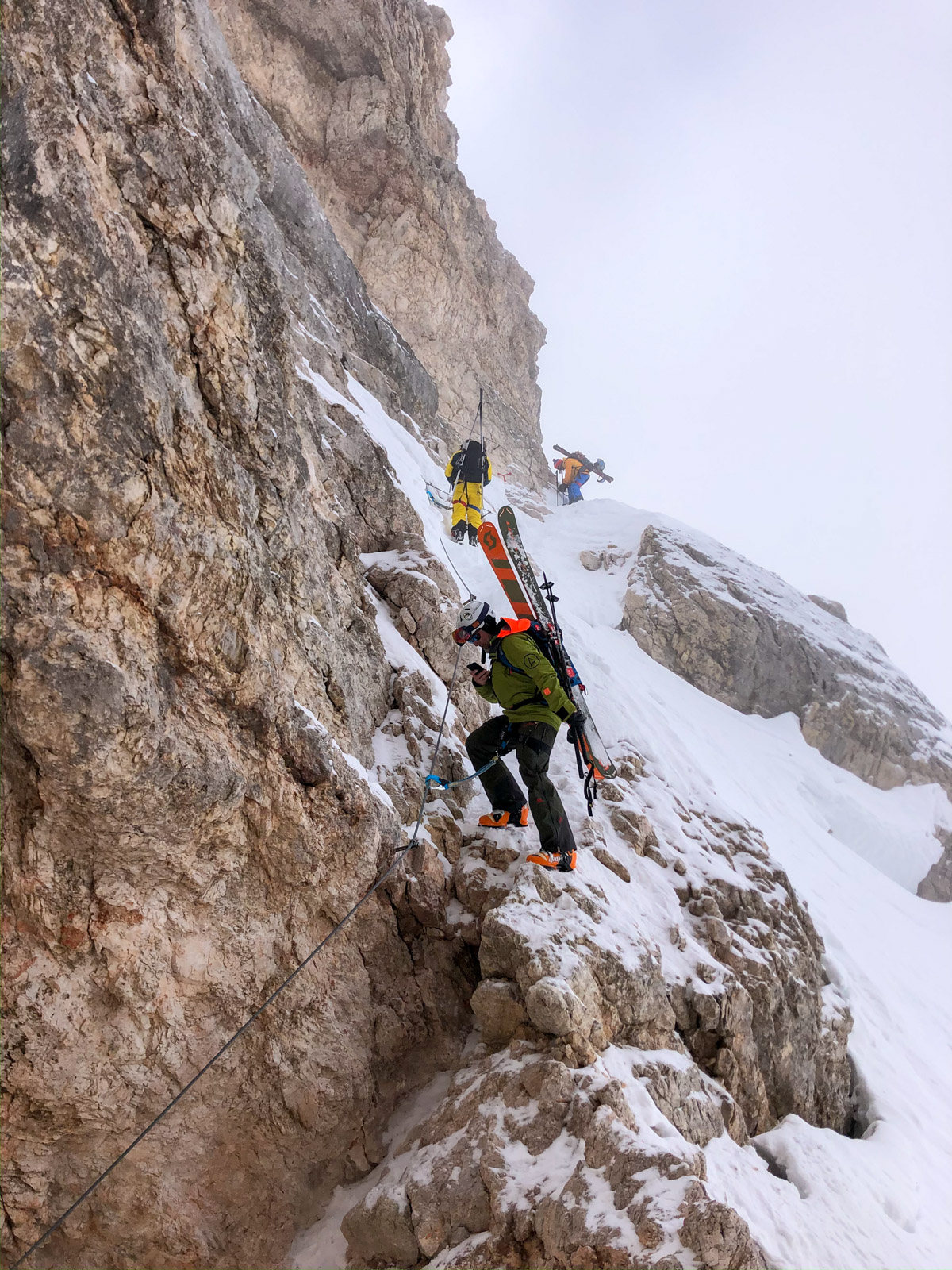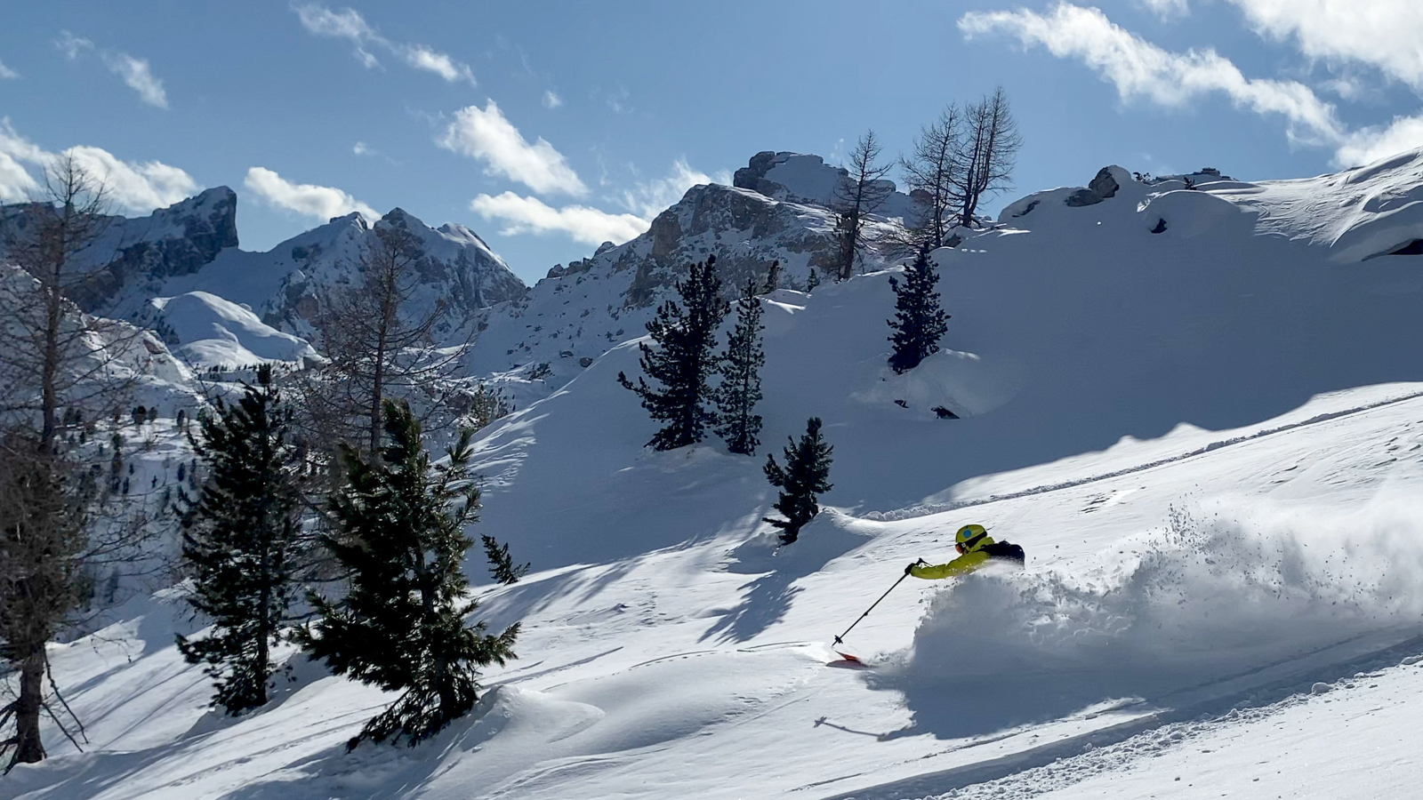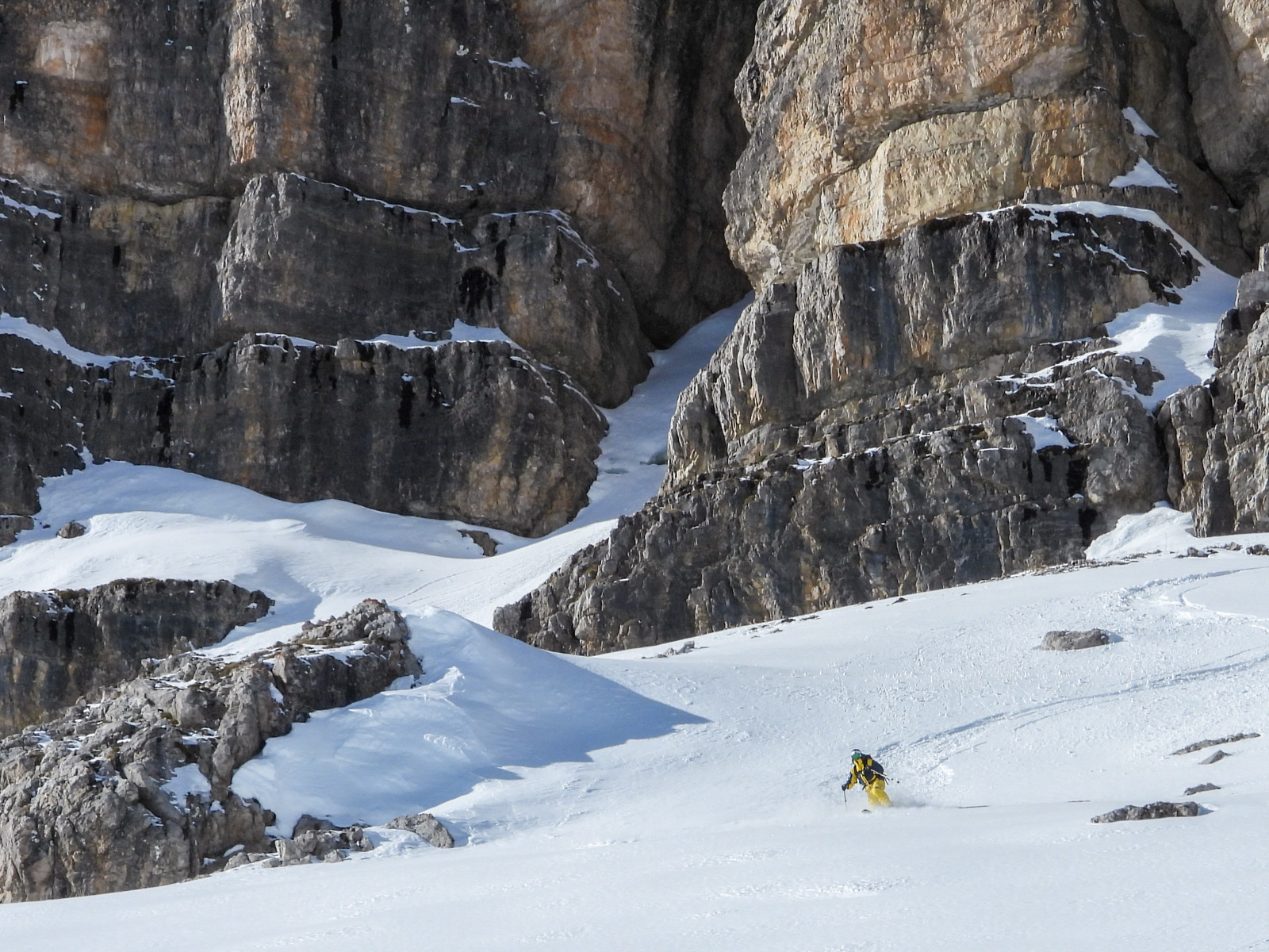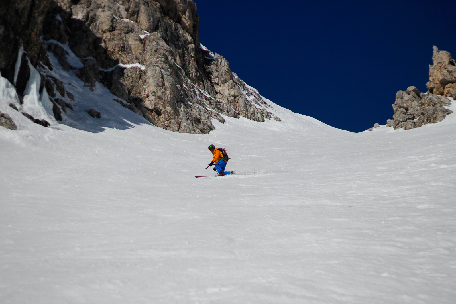 Samedi, dernière journée de ski dans les Dolomites, nous partons à 6h du matin pour admirer le lever du soleil derrière les montagnes. C’est notre «journée pachon». Il fait beau et chaud, une incroyable session, remplie de rires et de gamelles sur la piste. Nous terminons ainsi notre semaine italienne avec un dernier passage par le Bus de Tofana son couloir juste derrière et une halte au refuge d’Angelo Dibona.