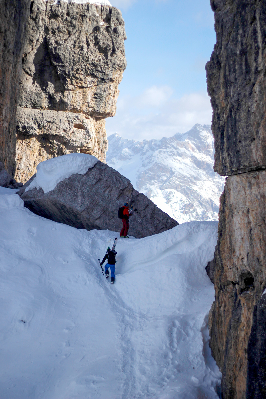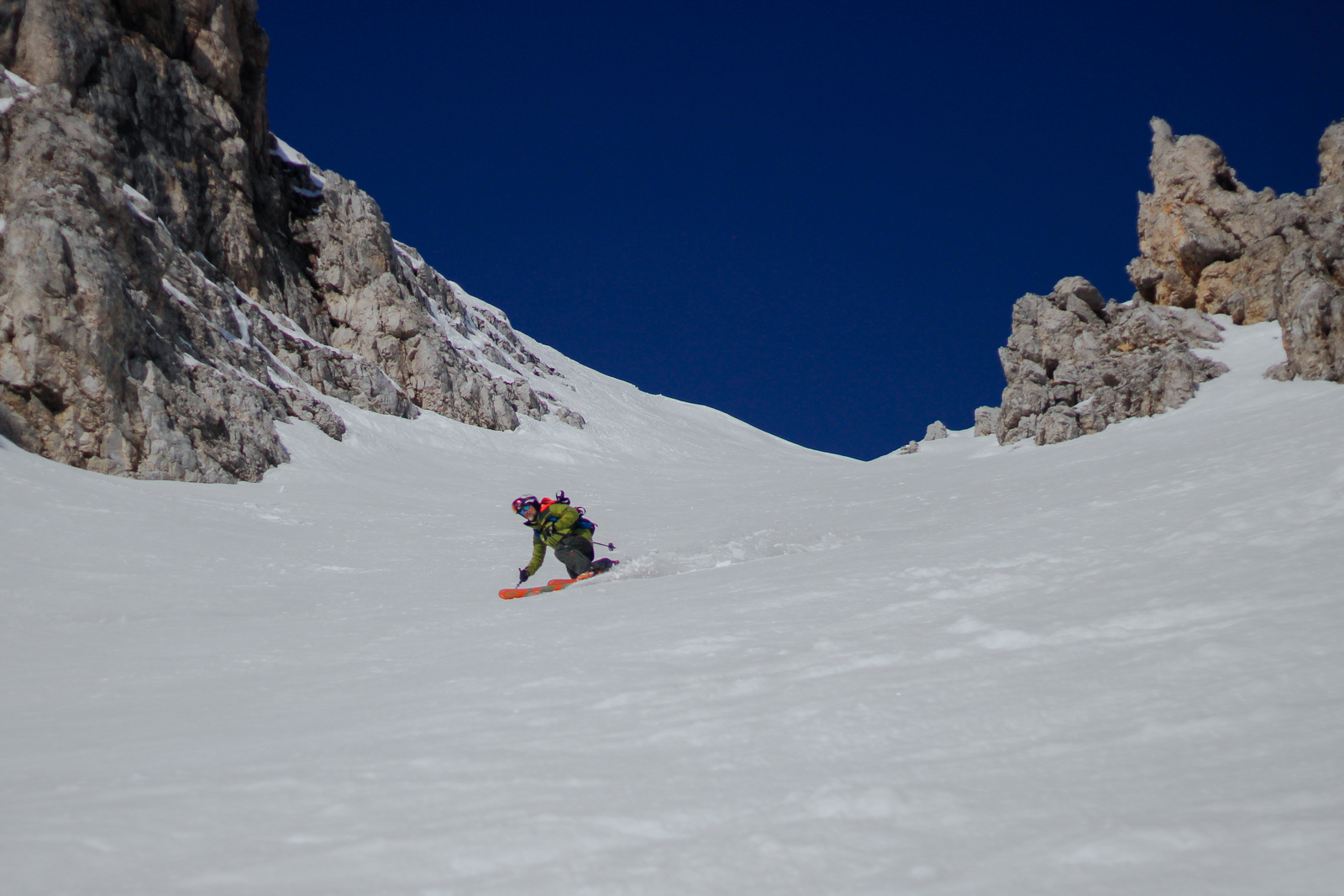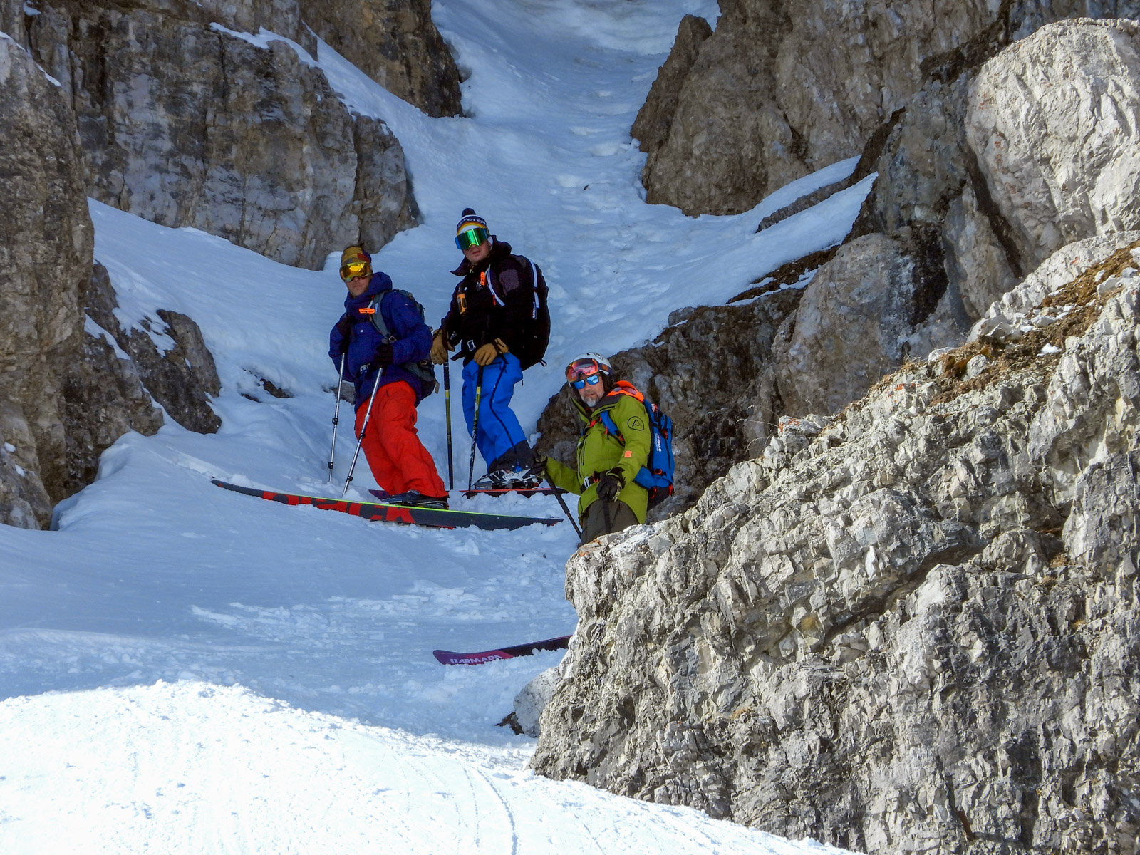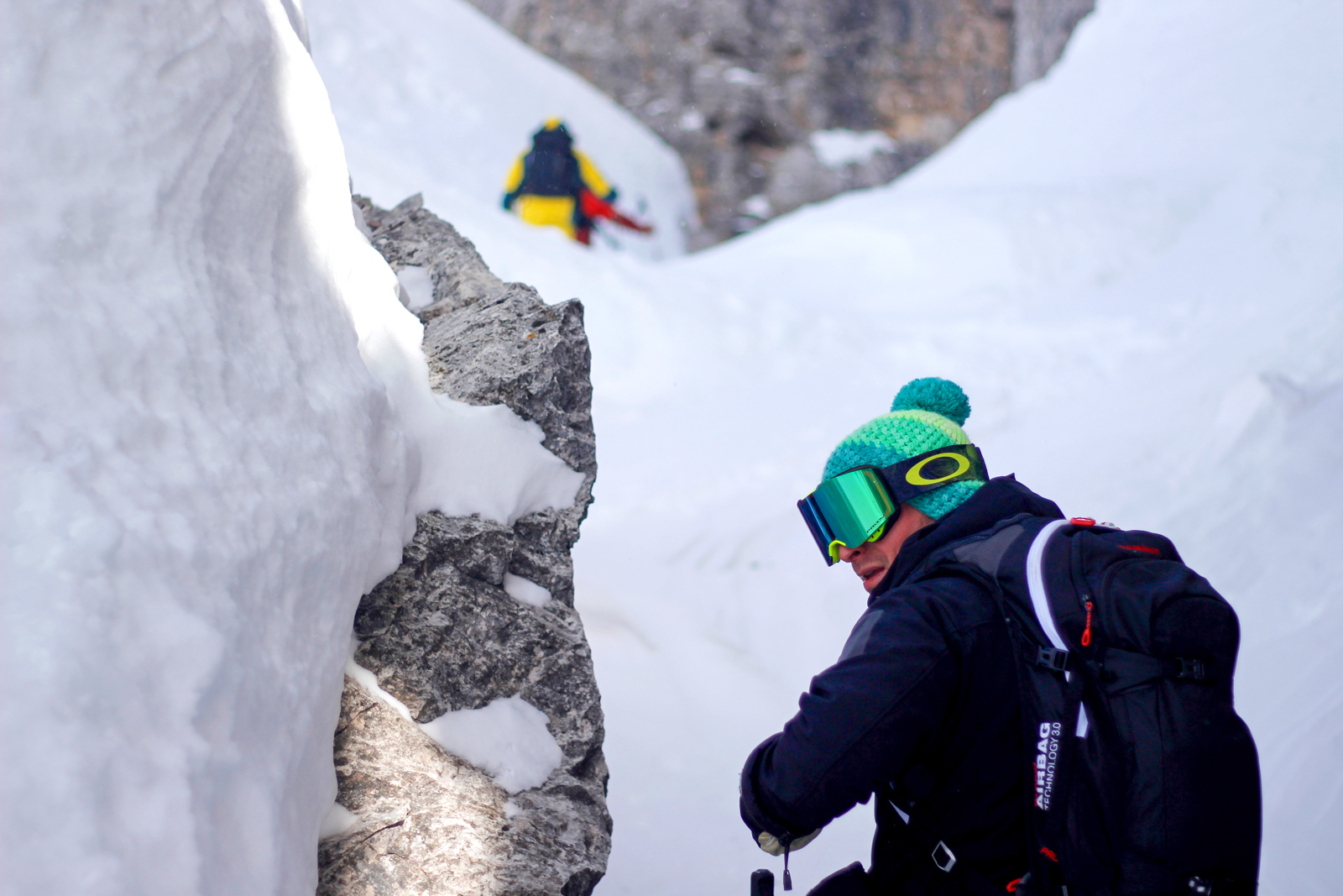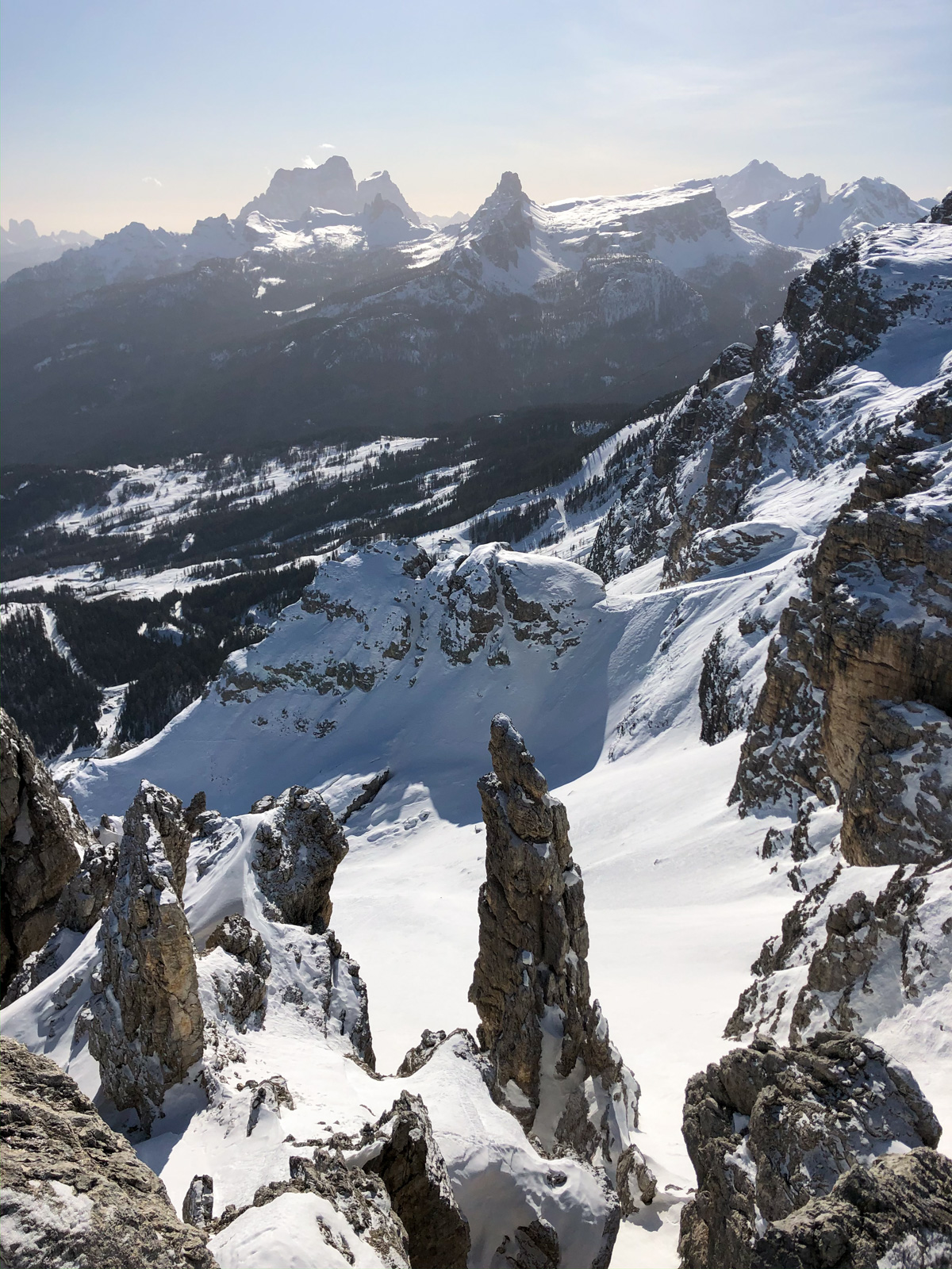 Samedi, dernière journée de ski dans les Dolomites, nous partons à 6h du matin pour admirer le lever du soleil derrière les montagnes. C’est notre «journée pachon». Il fait beau et chaud, une incroyable session, remplie de rires et de gamelles sur la piste. Nous terminons ainsi notre semaine italienne avec un dernier passage par le Bus de Tofana son couloir juste derrière et une halte au refuge d’Angelo Dibona.