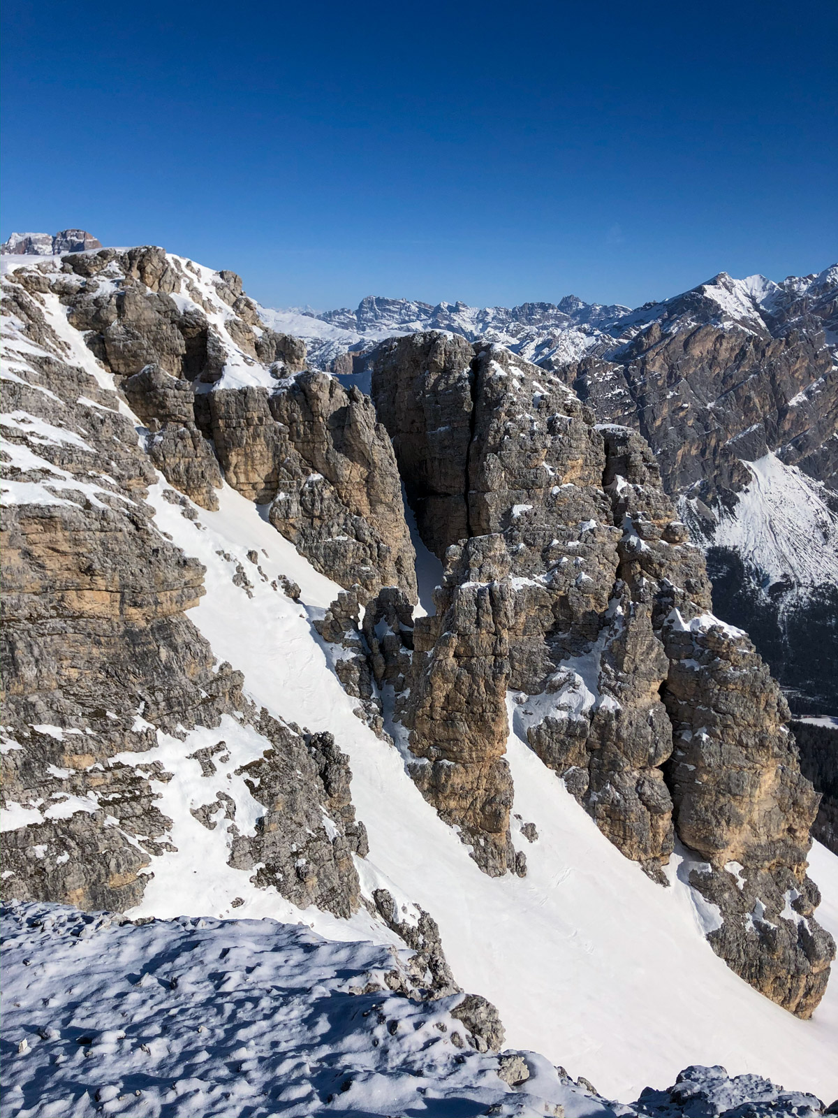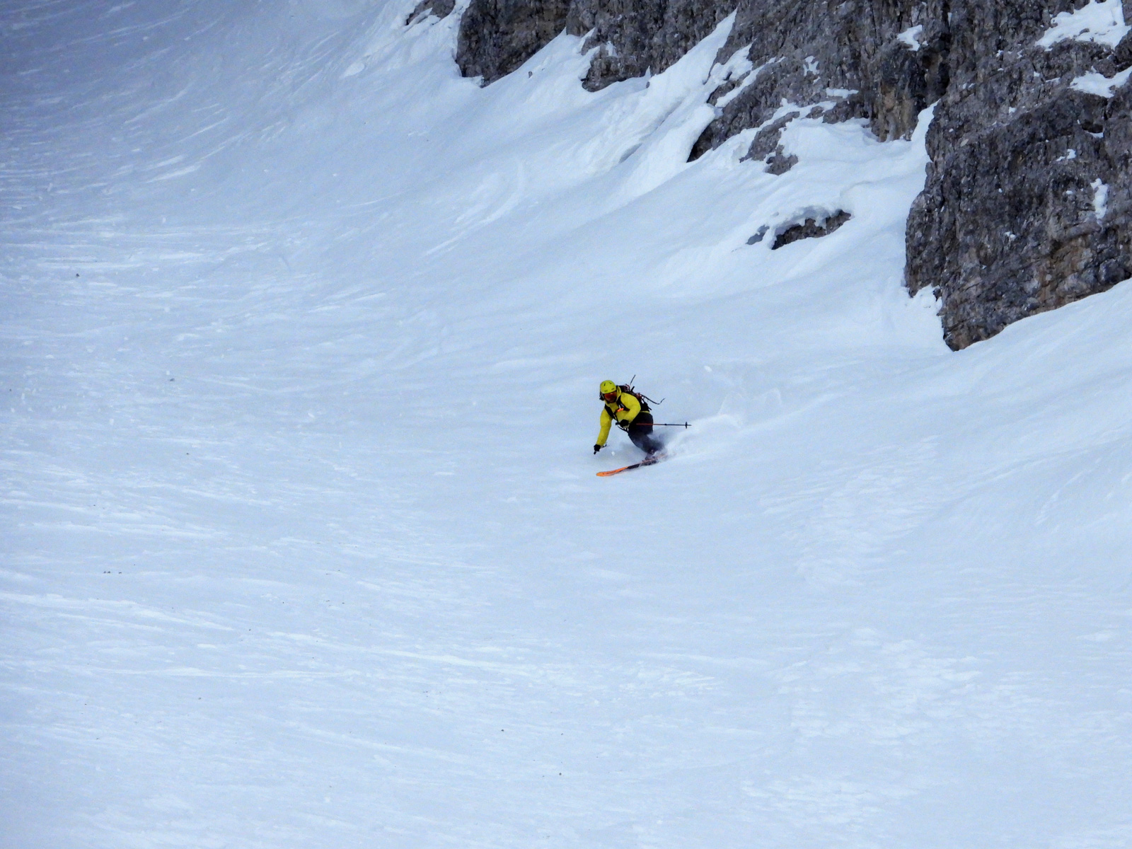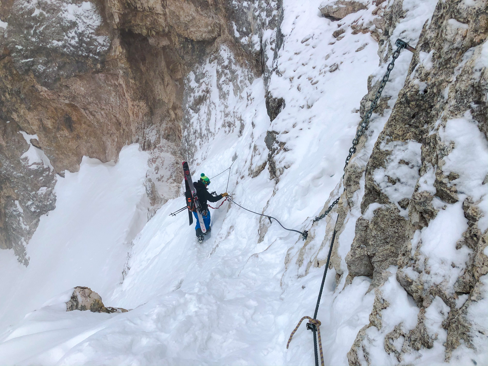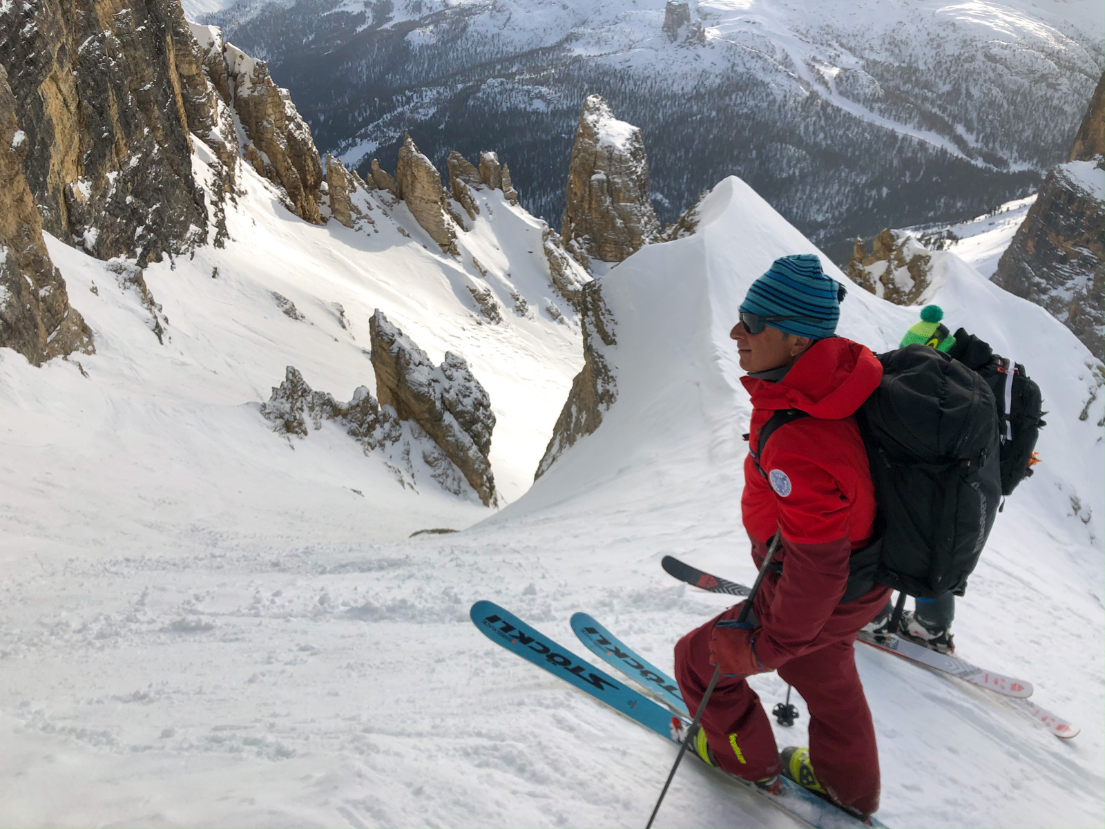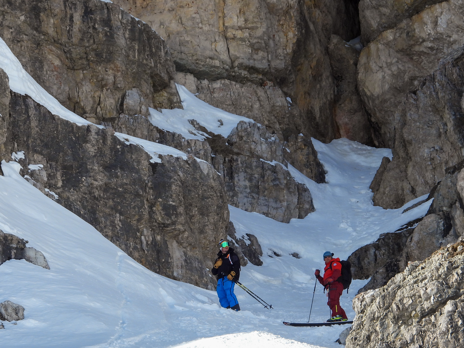 Samedi, dernière journée de ski dans les Dolomites, nous partons à 6h du matin pour admirer le lever du soleil derrière les montagnes. C’est notre «journée pachon». Il fait beau et chaud, une incroyable session, remplie de rires et de gamelles sur la piste. Nous terminons ainsi notre semaine italienne avec un dernier passage par le Bus de Tofana son couloir juste derrière et une halte au refuge d’Angelo Dibona.