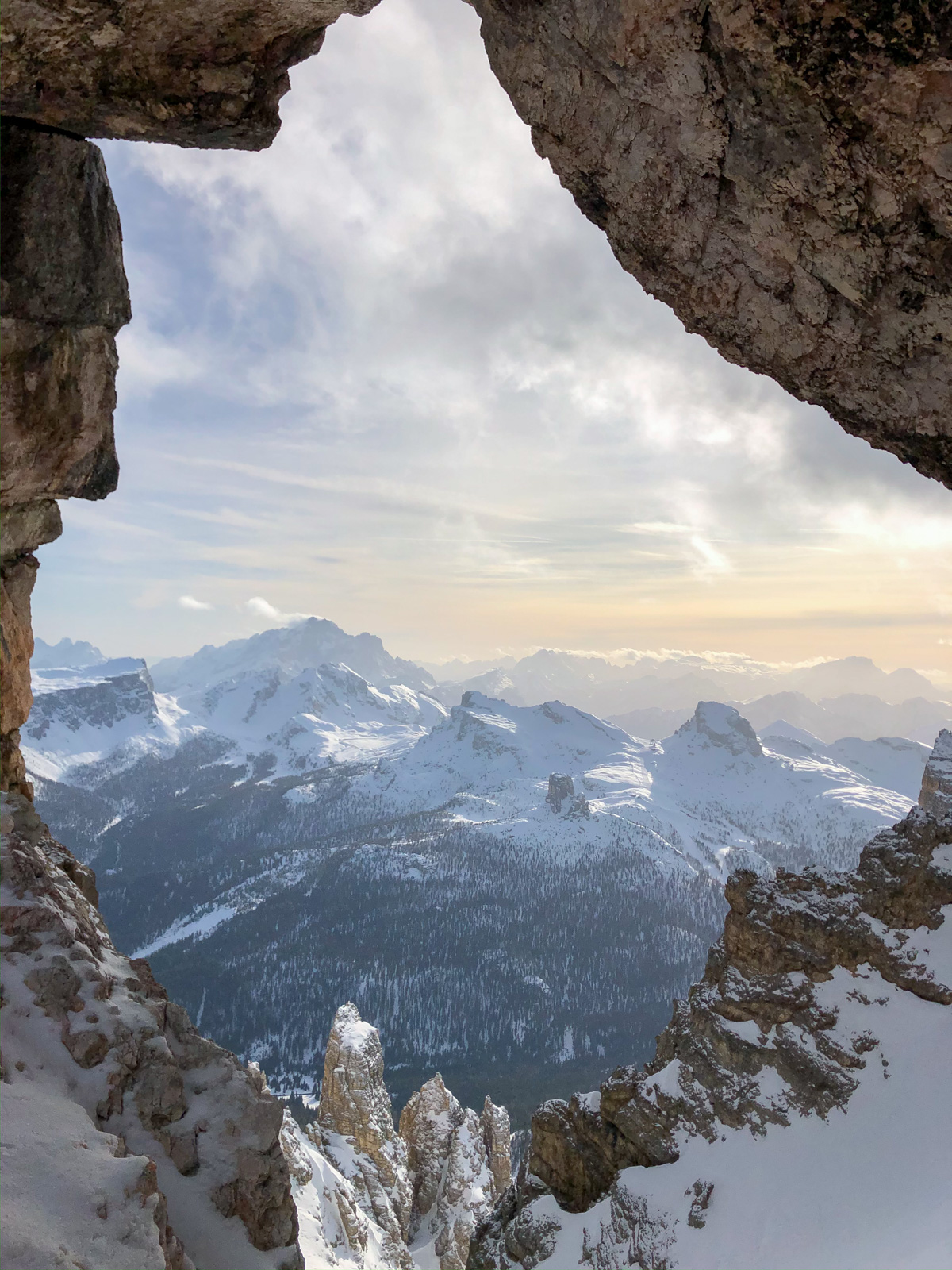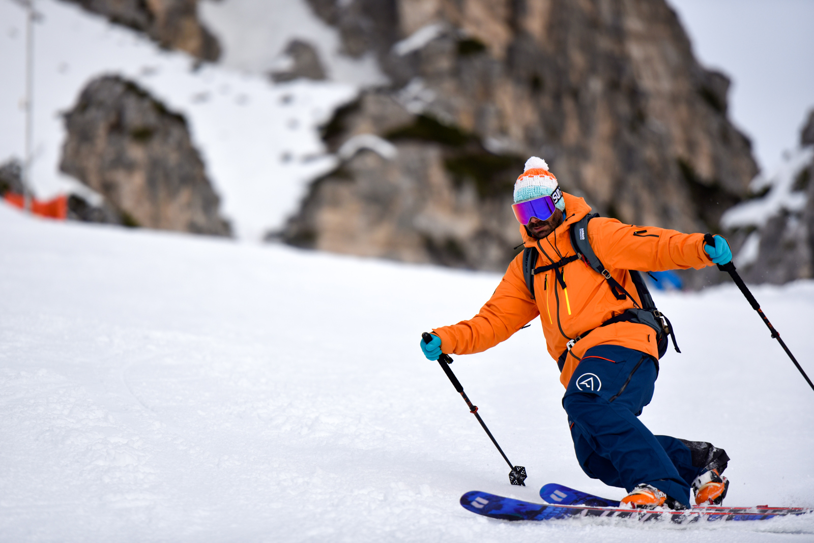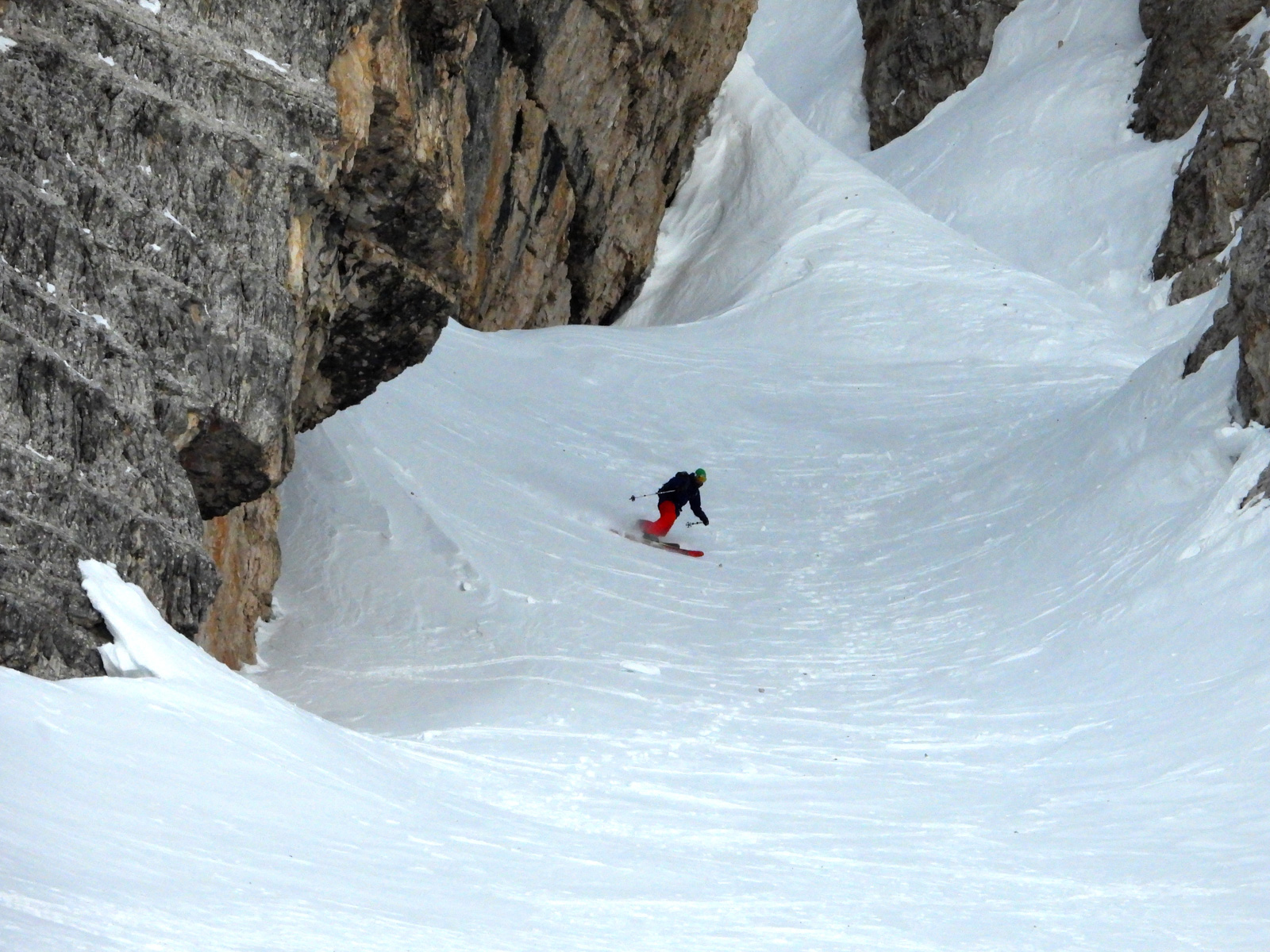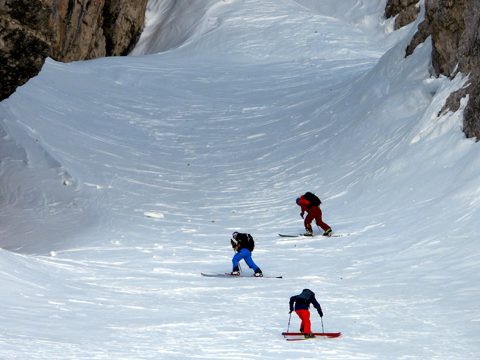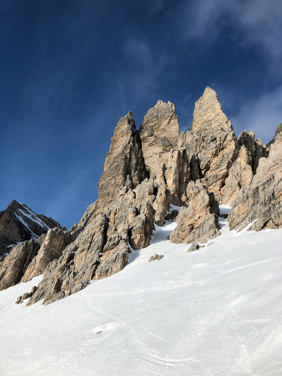Samedi, dernière journée de ski dans les Dolomites, nous partons à 6h du matin pour admirer le lever du soleil derrière les montagnes. C’est notre «journée pachon». Il fait beau et chaud, une incroyable session, remplie de rires et de gamelles sur la piste. Nous terminons ainsi notre semaine italienne avec un dernier passage par le Bus de Tofana son couloir juste derrière et une halte au refuge d’Angelo Dibona.