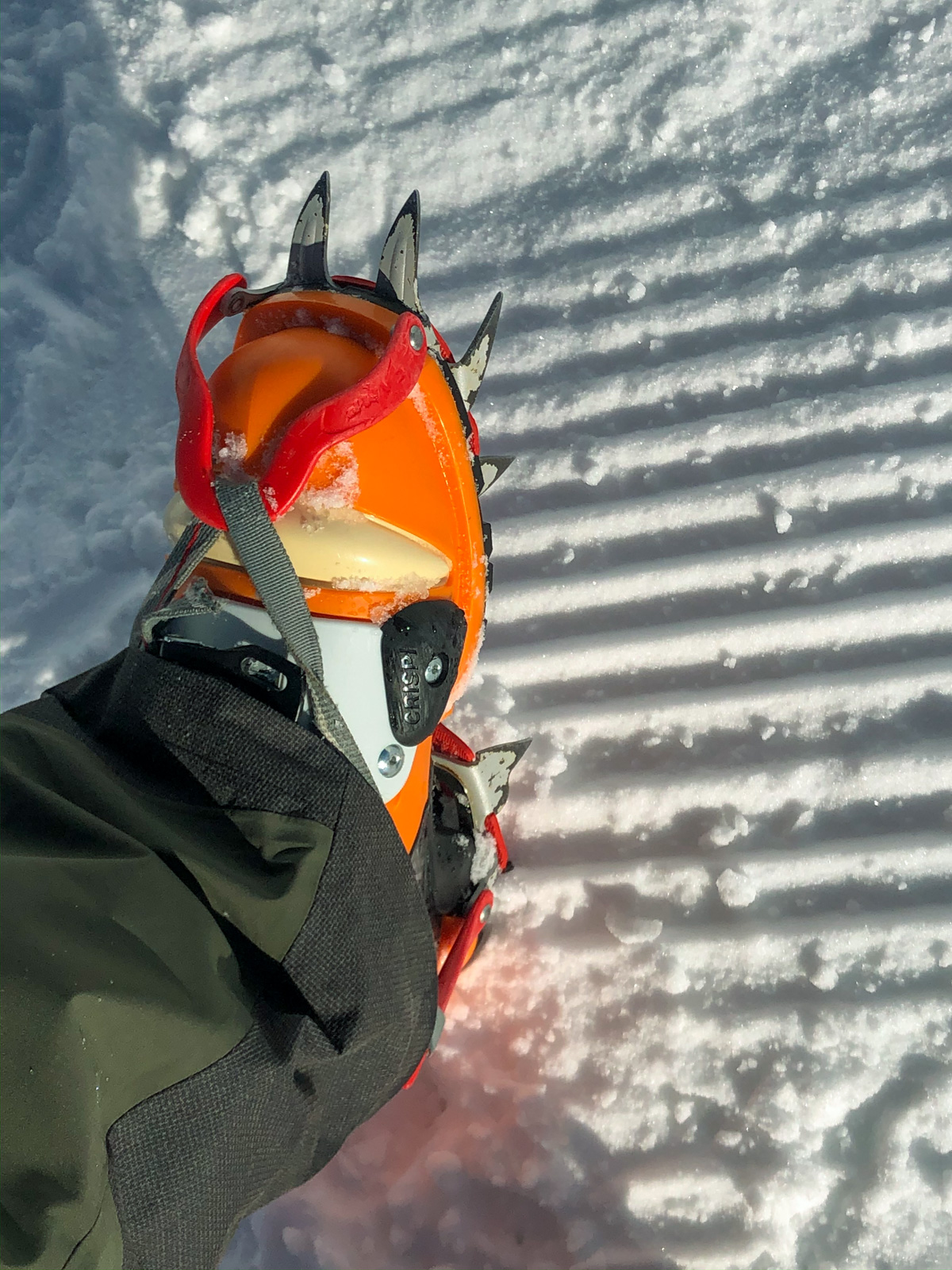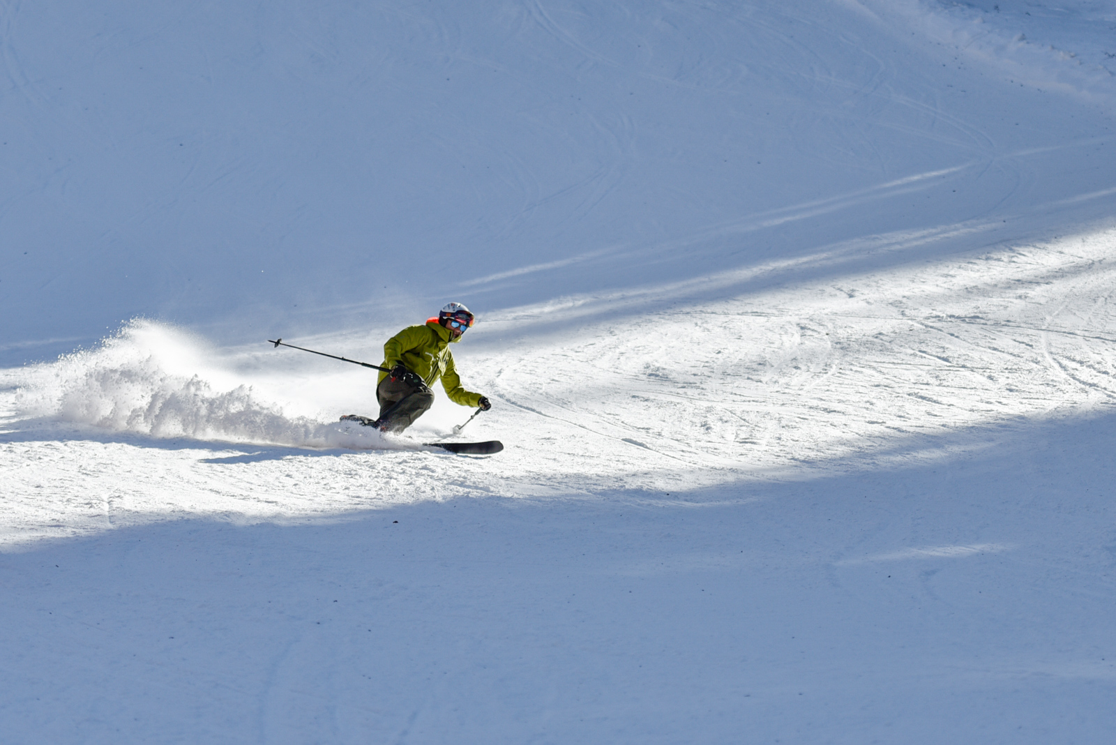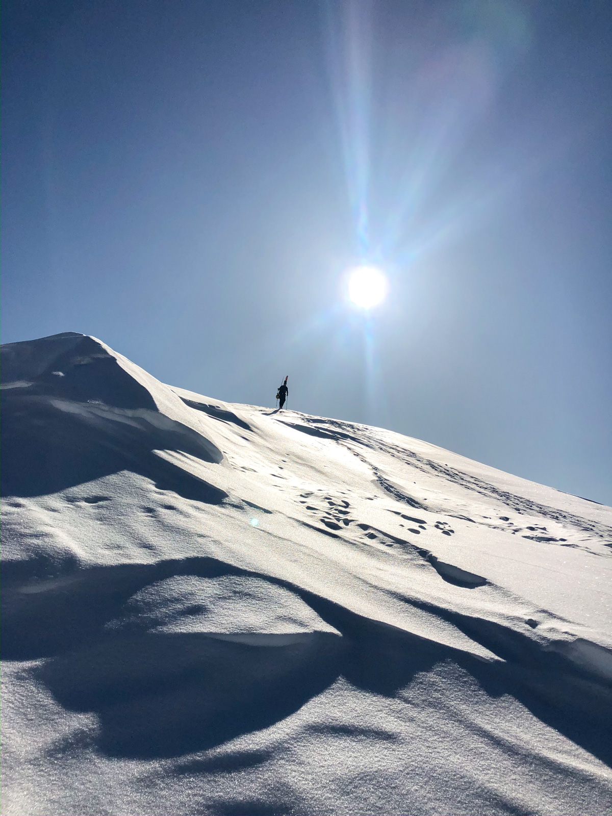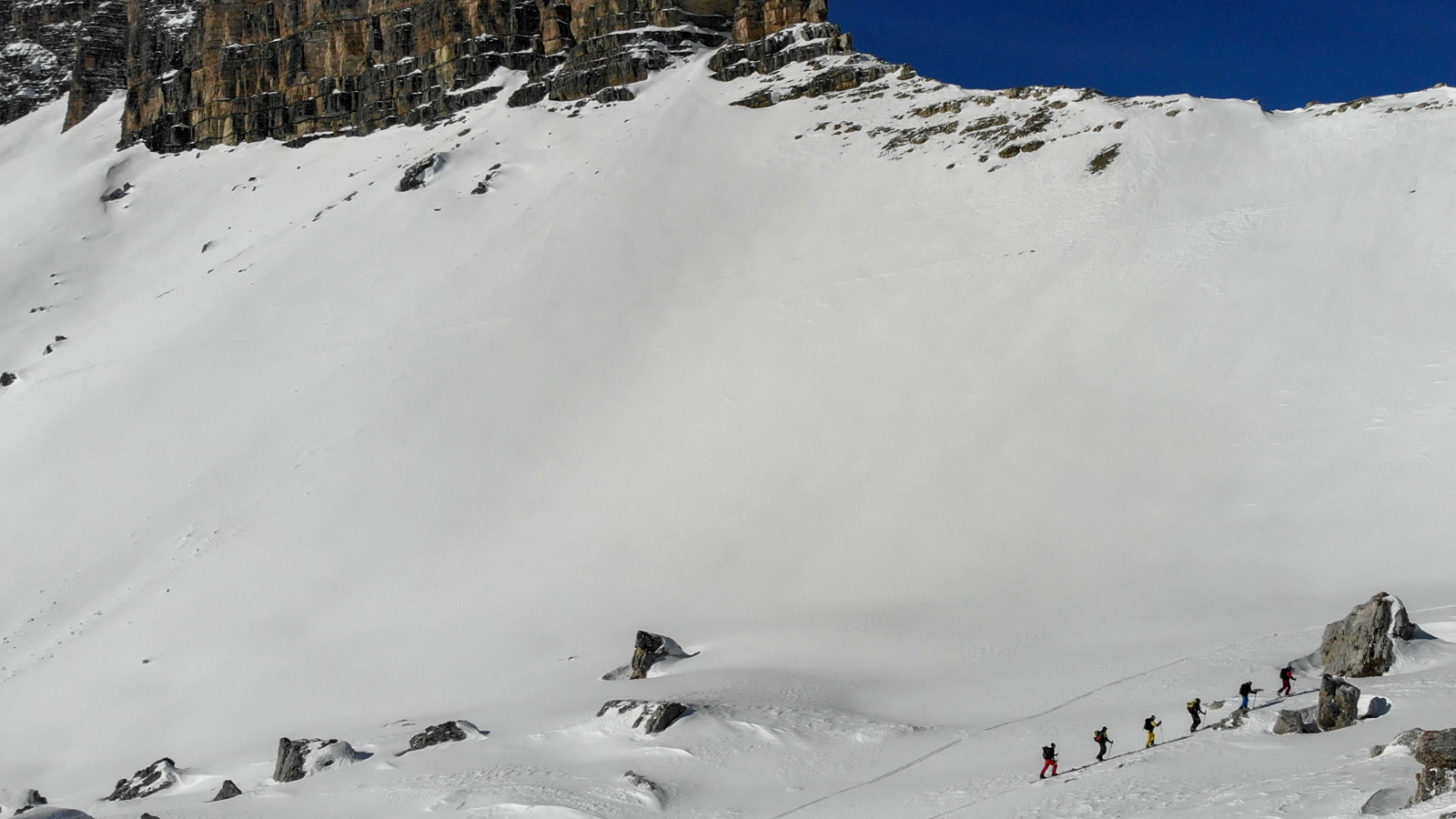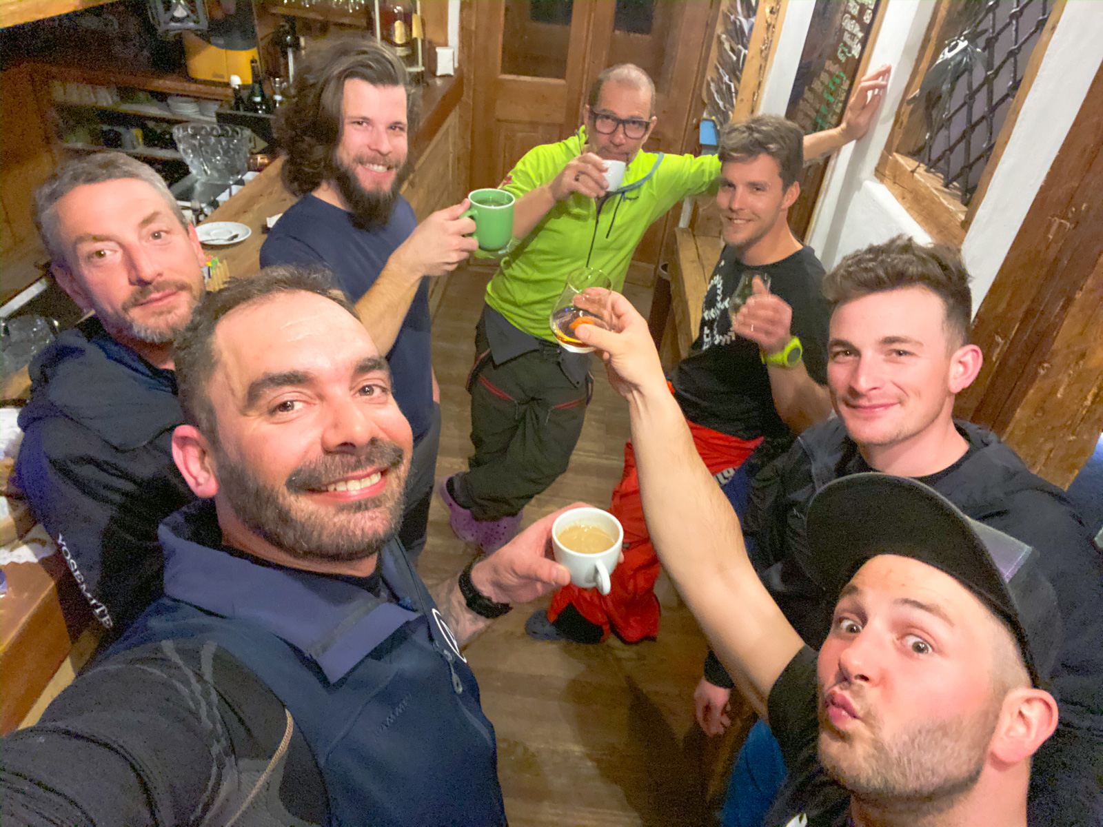 Samedi, dernière journée de ski dans les Dolomites, nous partons à 6h du matin pour admirer le lever du soleil derrière les montagnes. C’est notre «journée pachon». Il fait beau et chaud, une incroyable session, remplie de rires et de gamelles sur la piste. Nous terminons ainsi notre semaine italienne avec un dernier passage par le Bus de Tofana son couloir juste derrière et une halte au refuge d’Angelo Dibona.