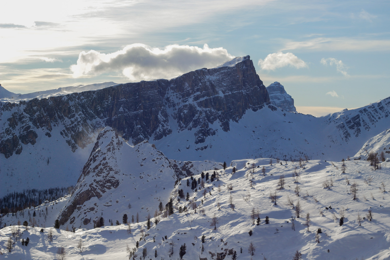 Milieu de semaine, direction le domaine de Cinque Torri. Une nuitée est organisée dans le refuge Scoiattoli sur les pistes. Une petite randonnée se fait de nuit pour rejoindre le refuge Averau, mais c’est sans compter la tempête qui se lève. La descente est un peu extrême. Nous dégustons ensuite le repas du soir bien mérité, avant de refaire le monde et de goûter à un breuvage local qui n’est pas sans nous rappeler un certain «Diablerets». Excellent! Le lendemain, nous nous rendons sur le domaine de Lagazuoi (la montagne creusée pendant la guerre est remplie d’explosifs, pour contrer les autrichiens) pour redescendre ensuite en direction de Forcella Tavenanzes.