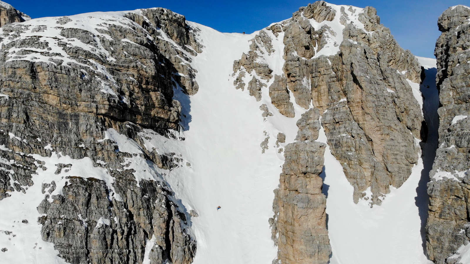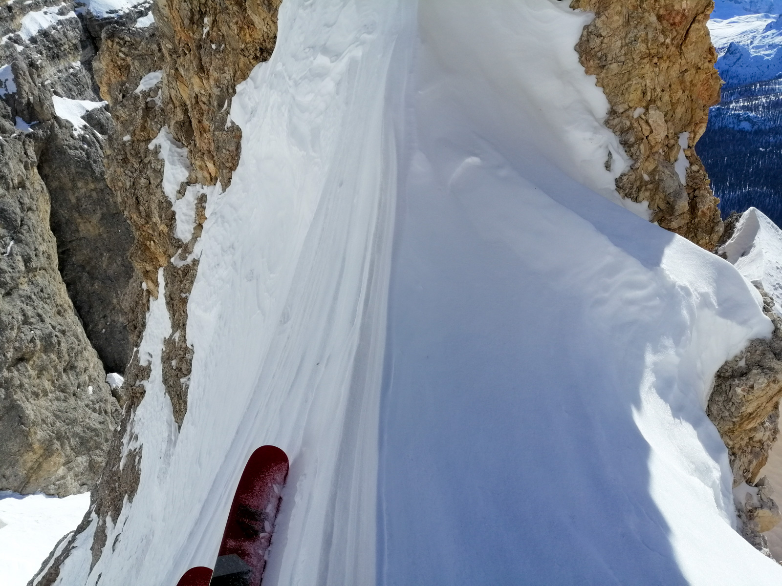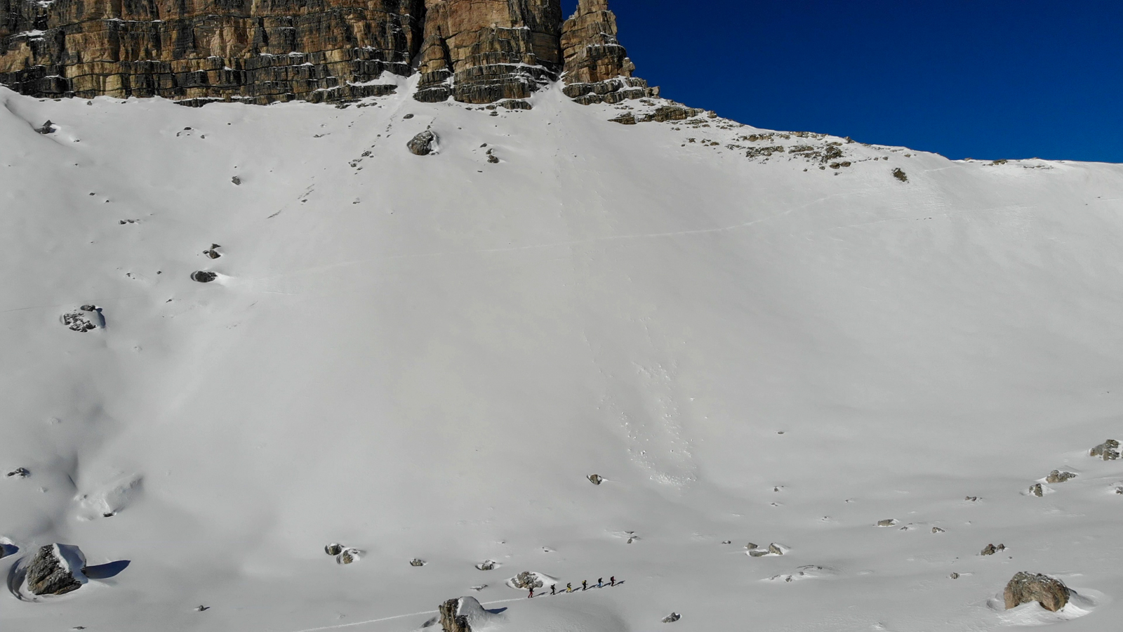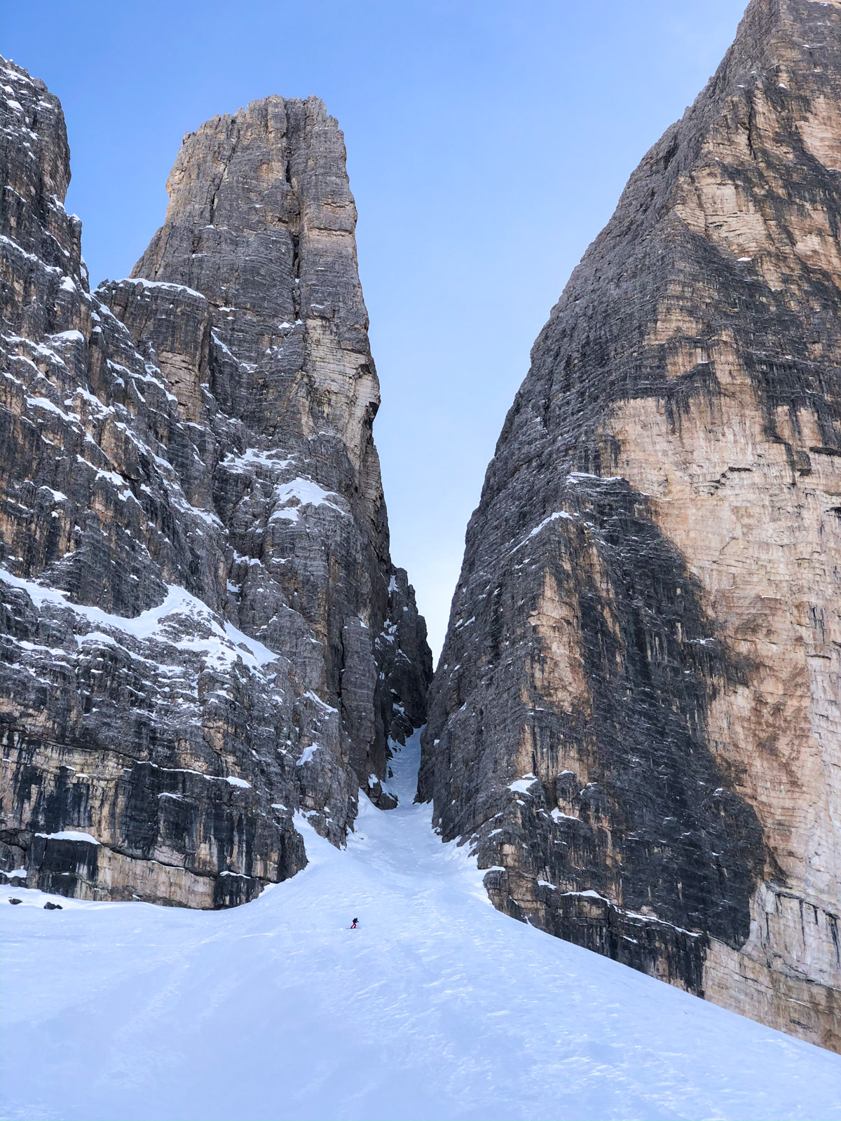La fin de notre trip approche et notre guide nous réserve de belles surprises jusqu’au dernier jour. Rendez-vous donc à Lago d’Antorno, où des motos neiges nous attendent pour rejoindre le refuge d’Auronzo. Suivi d’une petite montée en peaux de phoque pour atteindre le col Forcella Lavaredo. Après une petite pente incroyablement parfaite, nous longeons les faces des Tre Cime di Lavaredo jusqu’au fameux troisième couloir (qui n’a pas de nom). Depuis le sommet, nous descendons alors toute la vallée jusqu’au Lago di Landro. Faire le tour de cette montagne nous aura pris toute la journée. L’épuisement se fait sentir…
