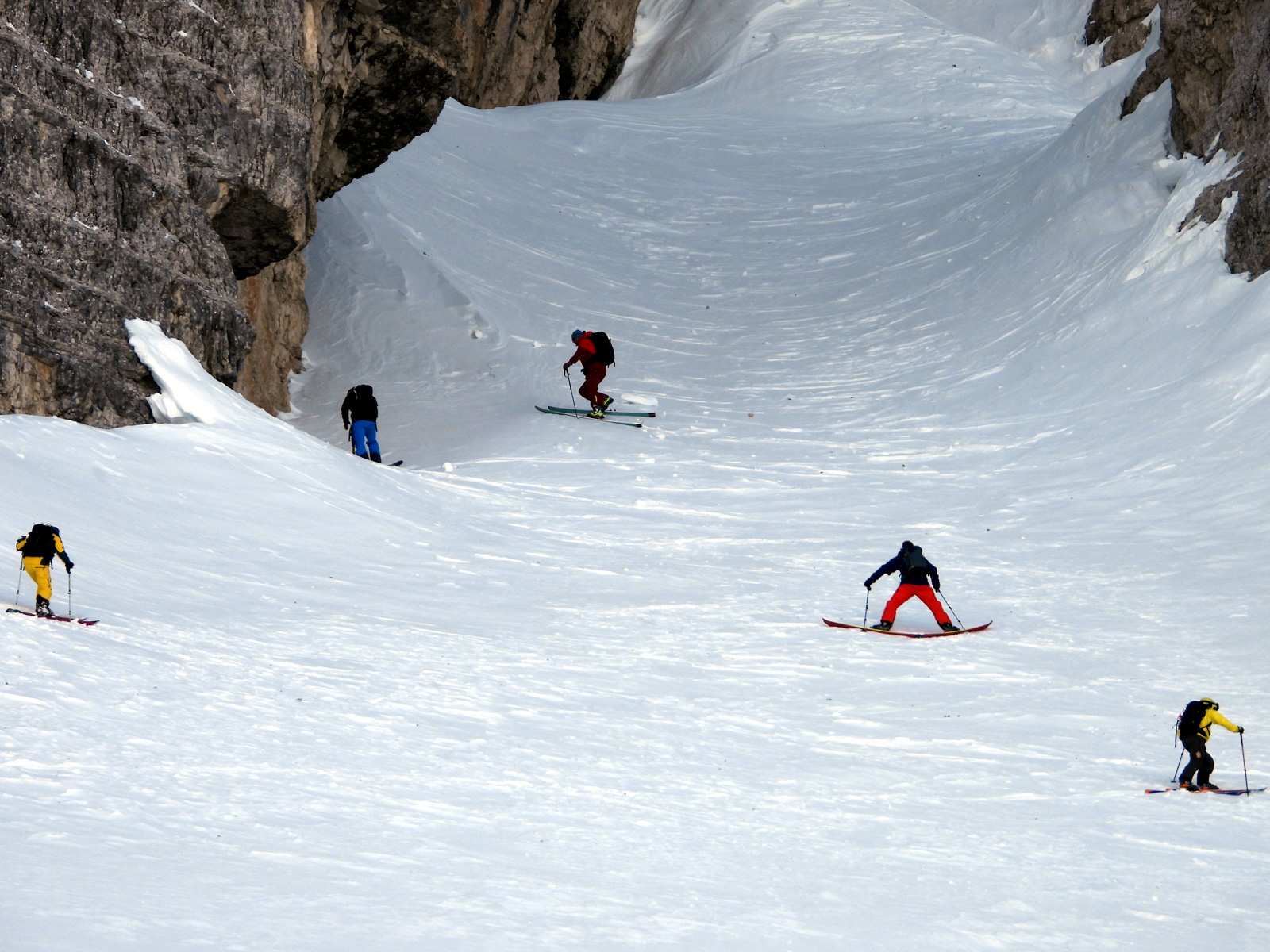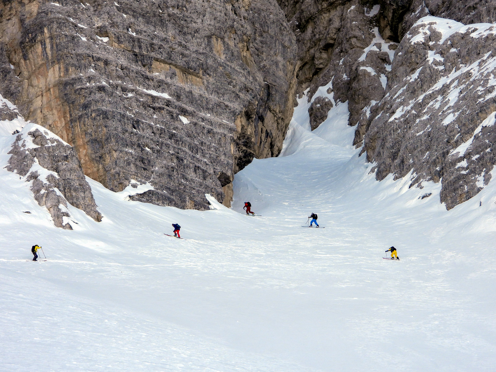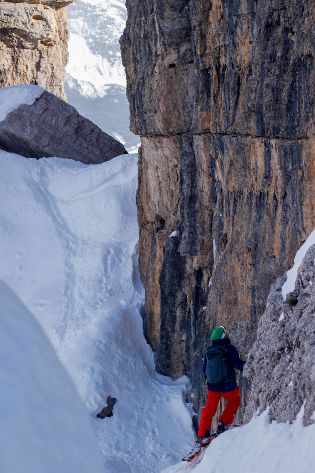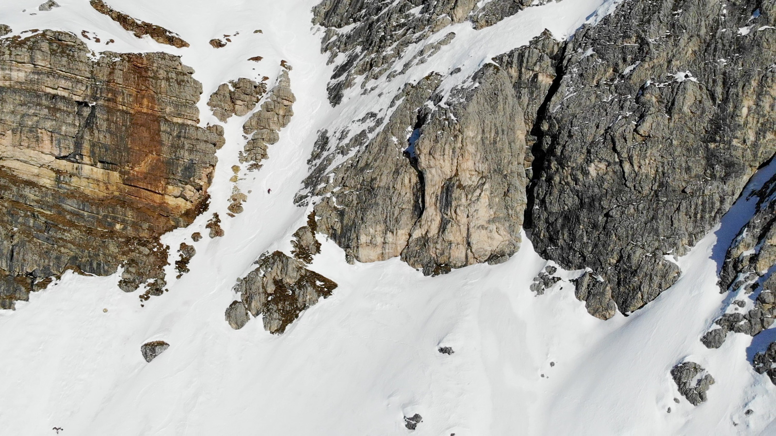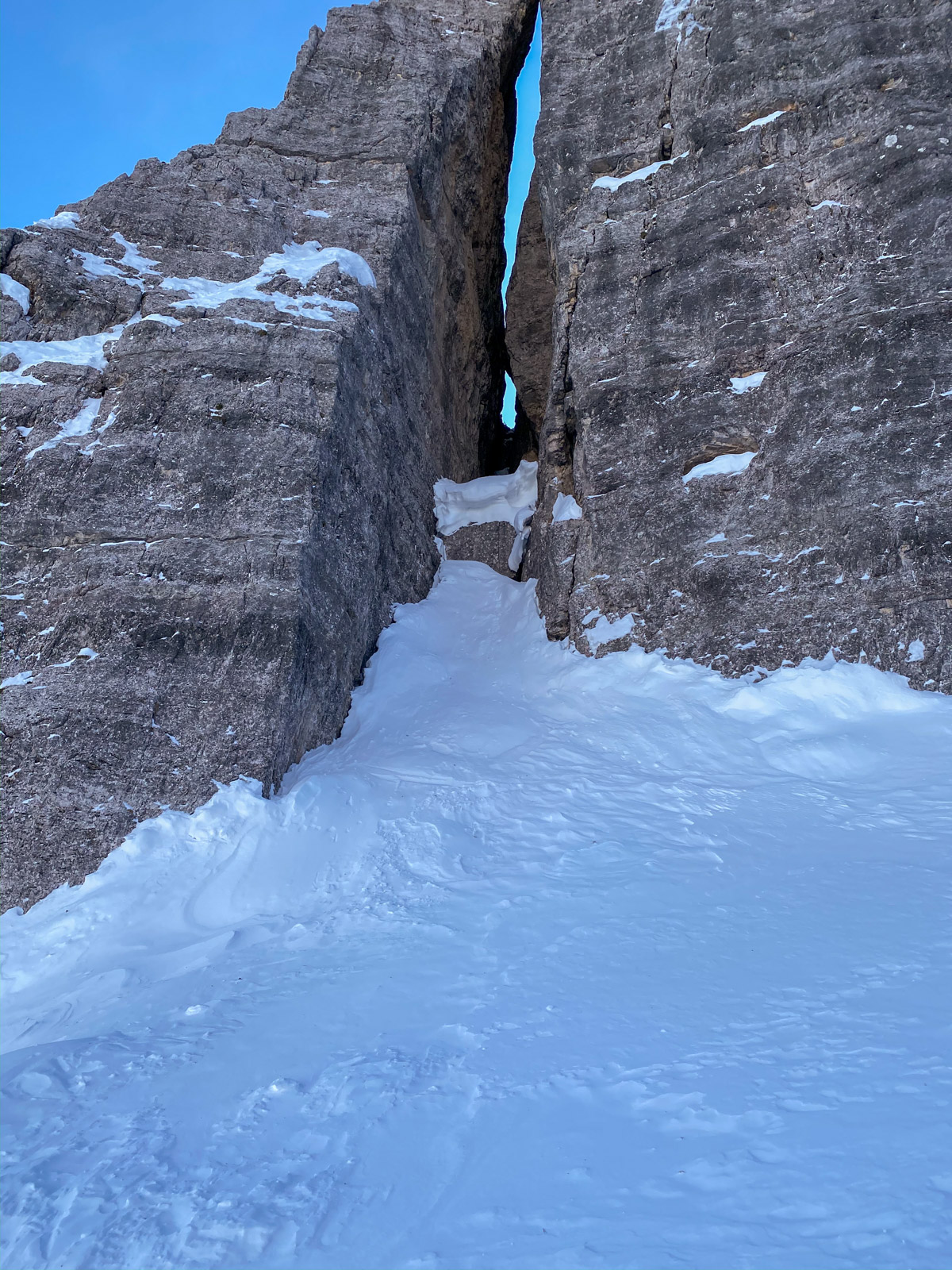 La fin de notre trip approche et notre guide nous réserve de belles surprises jusqu’au dernier jour. Rendez-vous donc à Lago d’Antorno, où des motos neiges nous attendent pour rejoindre le refuge d’Auronzo. Suivi d’une petite montée en peaux de phoque pour atteindre le col Forcella Lavaredo. Après une petite pente incroyablement parfaite, nous longeons les faces des Tre Cime di Lavaredo jusqu’au fameux troisième couloir (qui n’a pas de nom). Depuis le sommet, nous descendons alors toute la vallée jusqu’au Lago di Landro. Faire le tour de cette montagne nous aura pris toute la journée. L’épuisement se fait sentir…